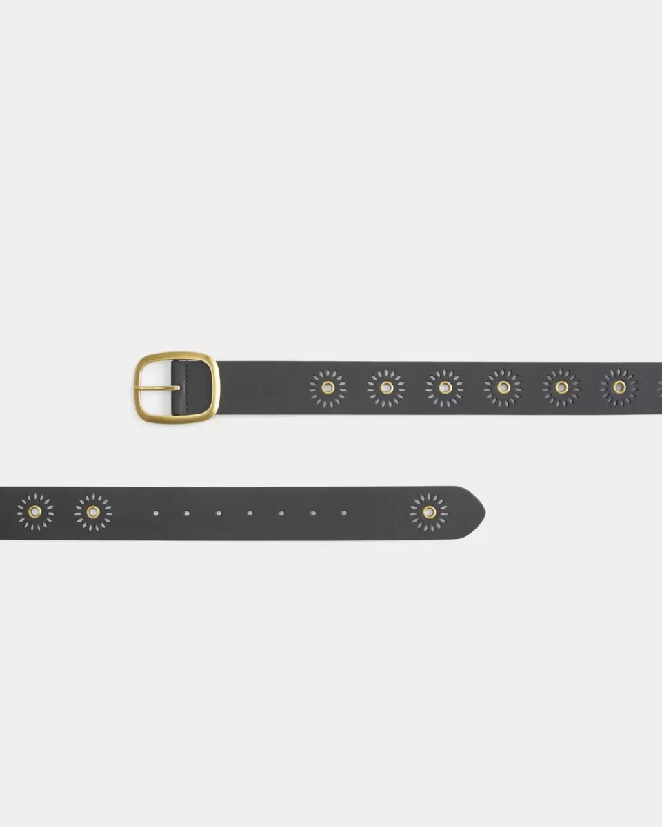 Det här söta bältet i konstläder har sunburstdetaljer med metallgenomföringar. Metallspänne. Importerad.