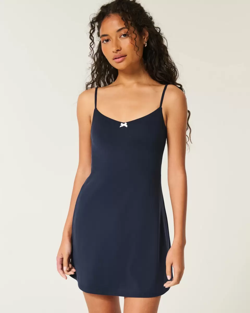 En ultrabekväm aktiv dagsklänning designad i vårt andningsbara, 4-vägsstretch, fuktavledande Recharge-tyg med en supermjuk, borstad känsla. Inbyggd hyllbh med avtagbara kuddar, inbyggda badrumsvänliga shorts med ficka. Söt rosettdetalj vid halsringningen, justerbara axelband. Importerad.