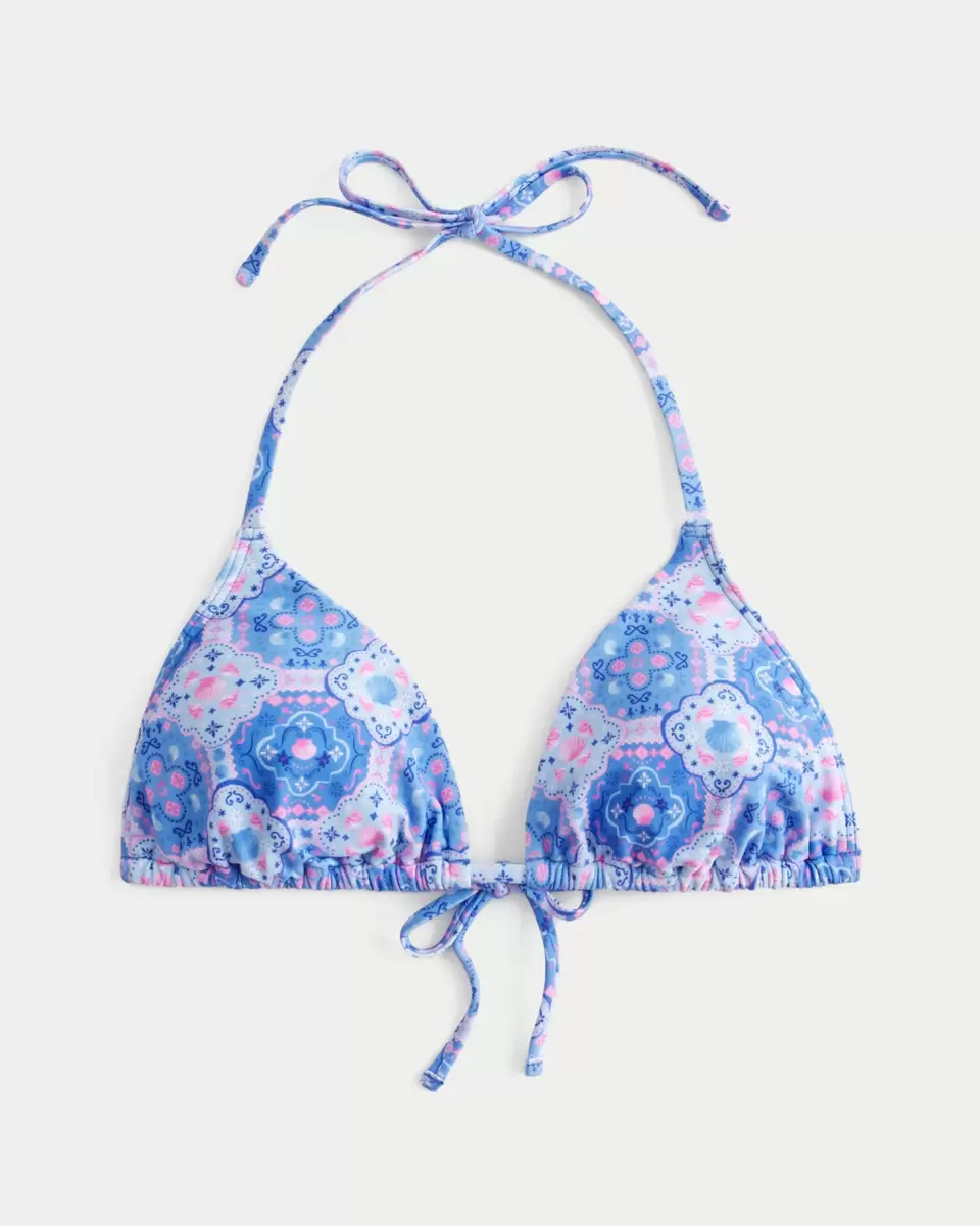 Denna söta triangelbikinitopp har en knytstängning och ett spring-break-inspirerat mönster. Mjukt simtyg, avtagbar stoppning. Importerad.