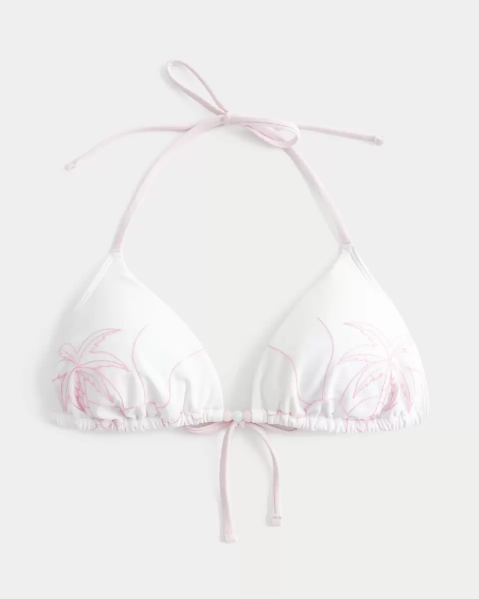 Denna söta triangelbikinitopp har pärldetaljer, en knytstängning och en broderad springbreak-inspirerad grafik. Mjukt simtyg, avtagbar stoppning. Importerad.