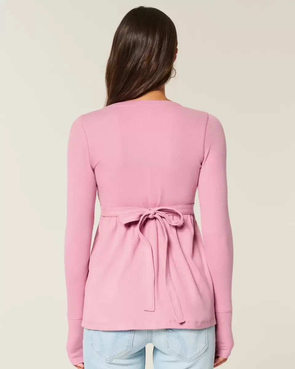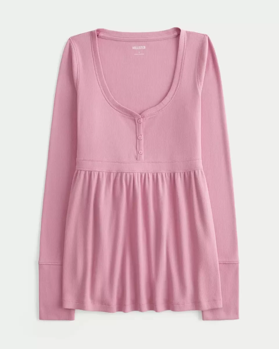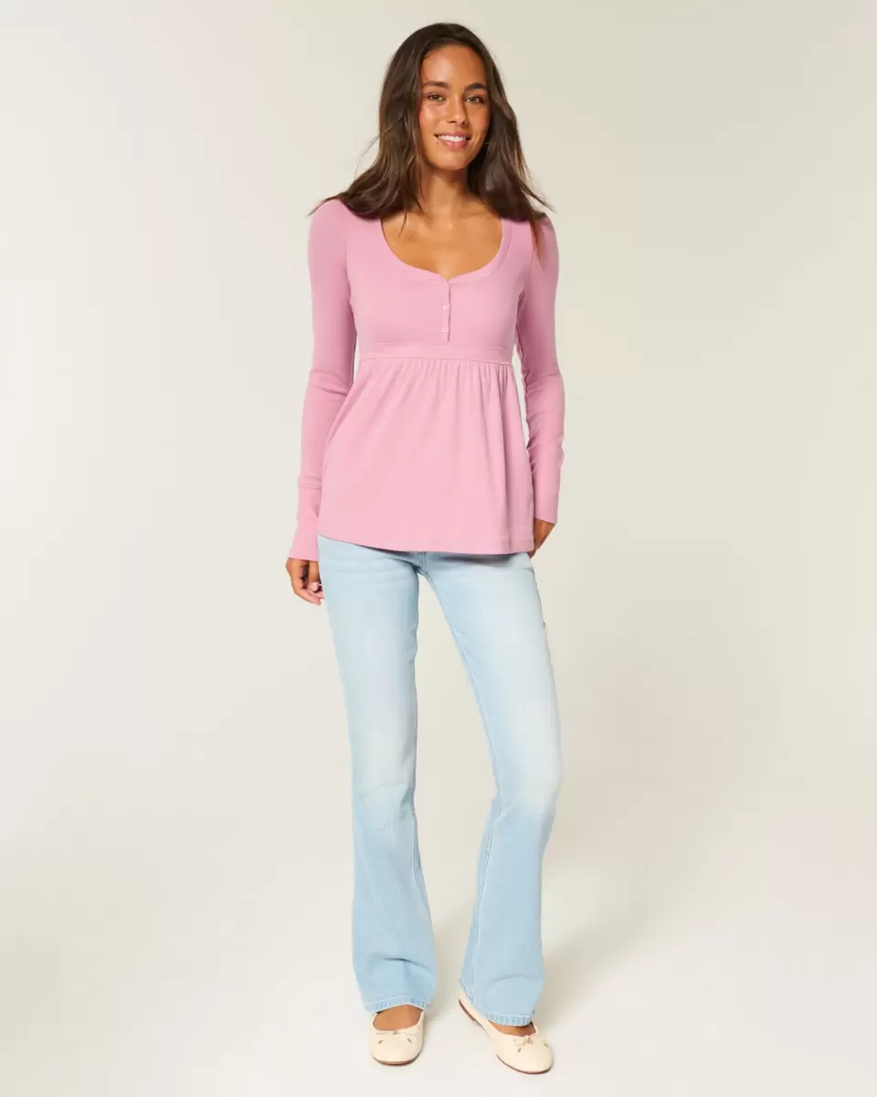 Söt och supermjuk, denna babydoll-topp har en knappslå i Henley-stil och knytband baktill. Långa ärmar. Importerad.