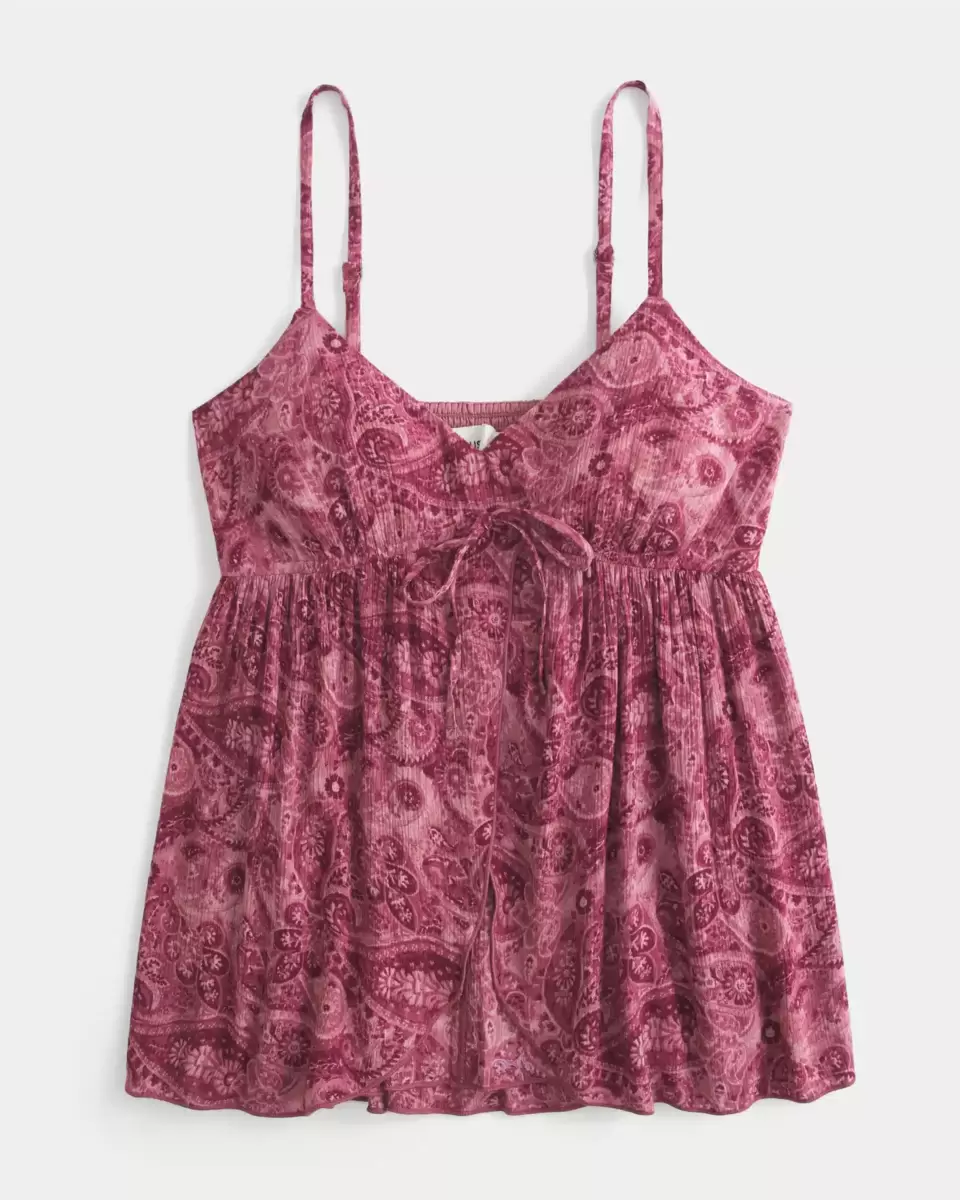 Flytig och supermjuk, denna babydoll-topp är gjord av skrynkligt tyg och har ett heltäckande mönster. Flyaway siluett, justerbara remmar, mitten knytdetalj. Importerad.