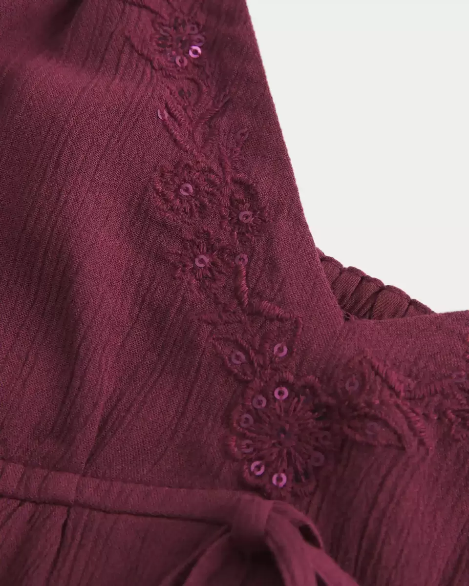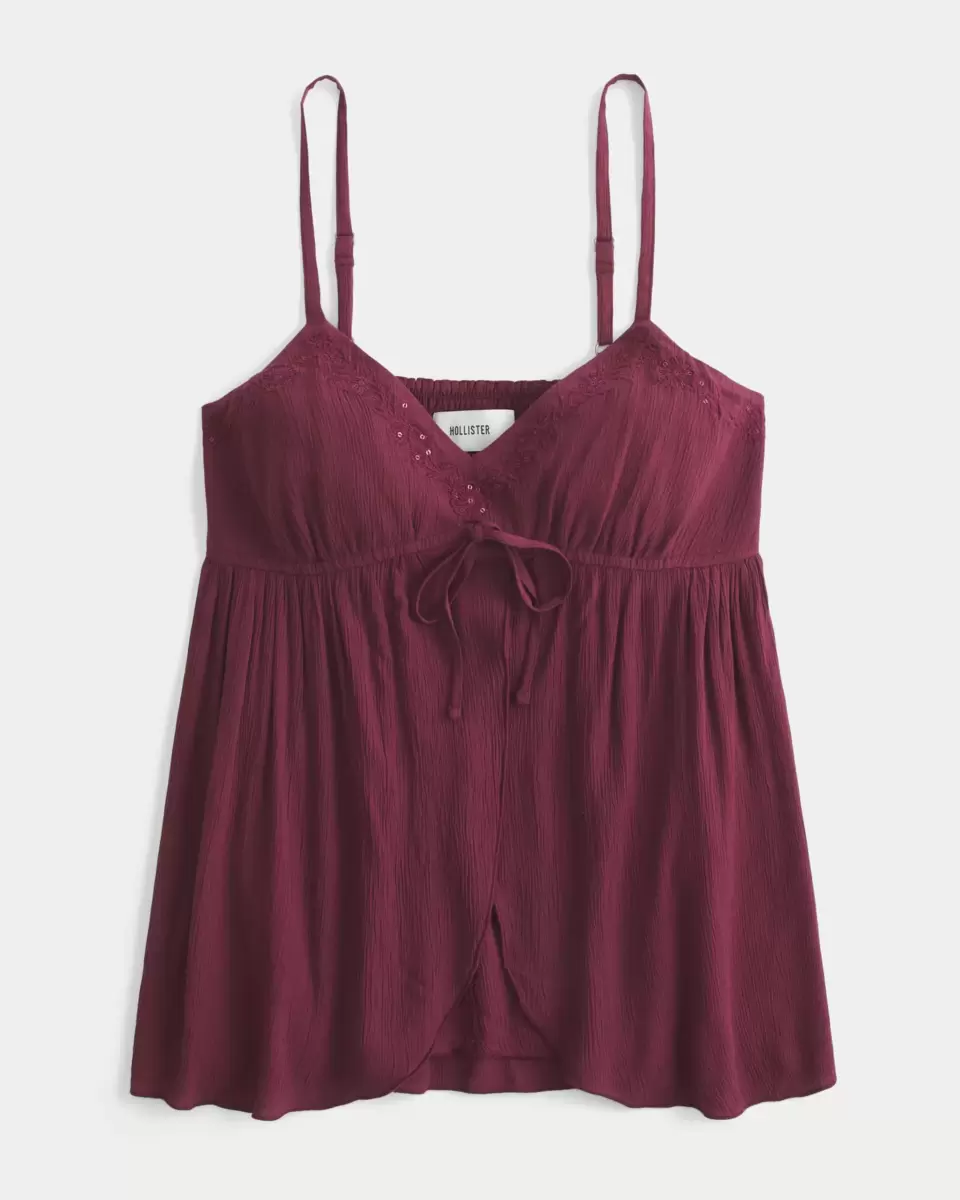 Flytig och supermjuk, denna babydoll-topp är gjord av skrynkligt tyg och har broderade detaljer längs halsen med vackra glänsande detaljer. Flyaway siluett, justerbara remmar, mitten knytdetalj. Importerad.