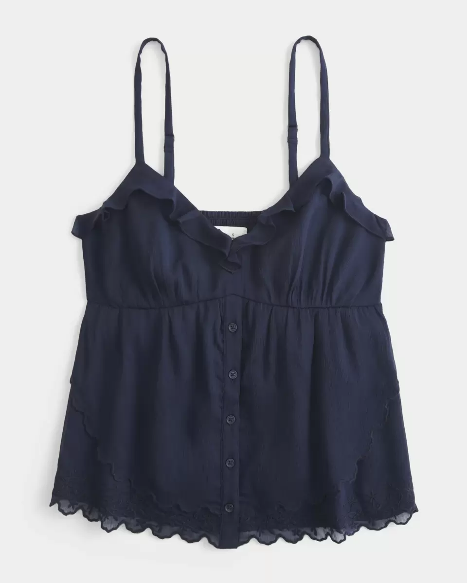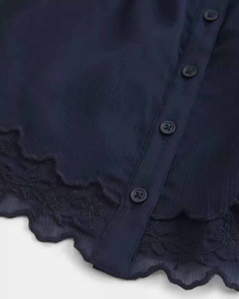 Tillverkad med supermjukt, flytande krinklet chiffongtyg, denna babydoll-topp har volanger och en skiktad fåll med broderi. Knappdetaljer, mjuk smock bak. Ser fantastiskt ut klädd upp eller ner! Importerad.