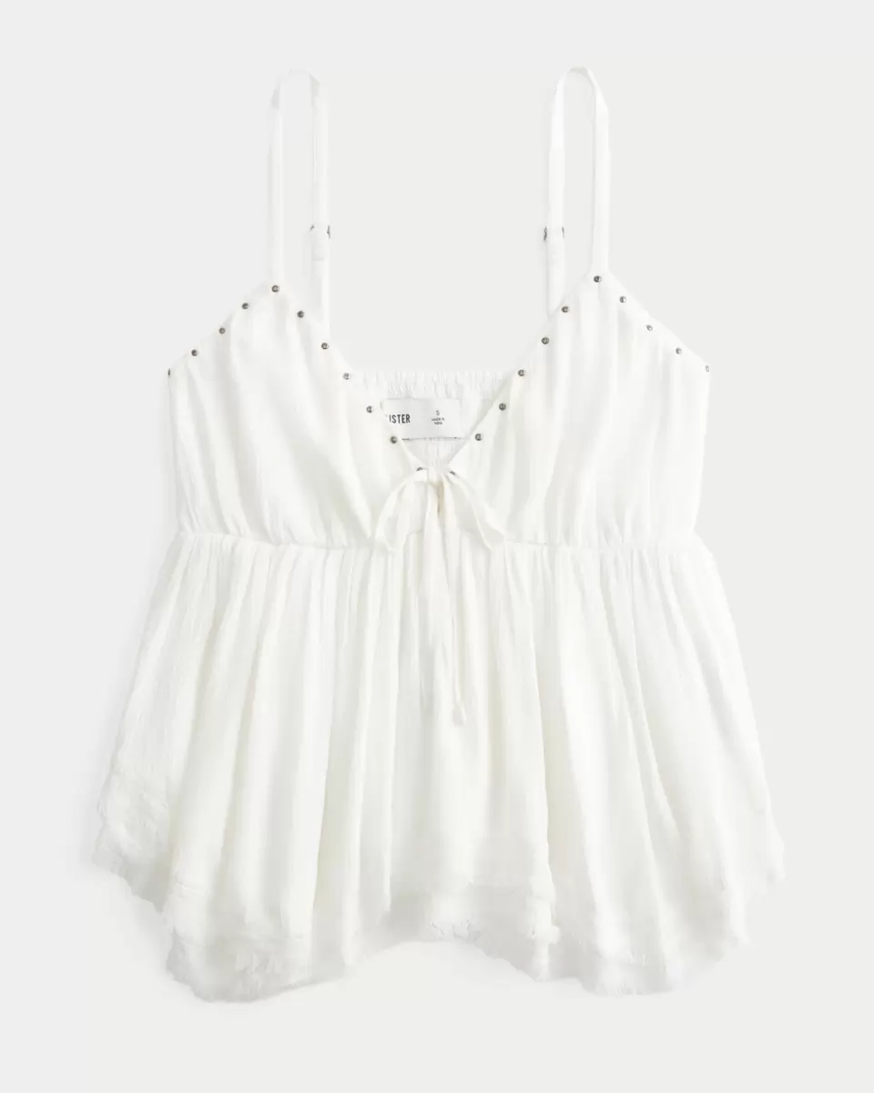 Flytig och supermjuk, denna boho-inspirerade babydoll-topp har nidddetaljer längs halsen och en fransfåll. Mjuk smockad rygg, ser perfekt ut klädd upp eller ner! Easy Fit. Importerad.