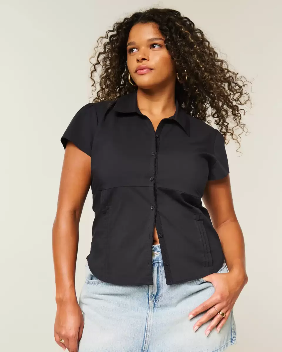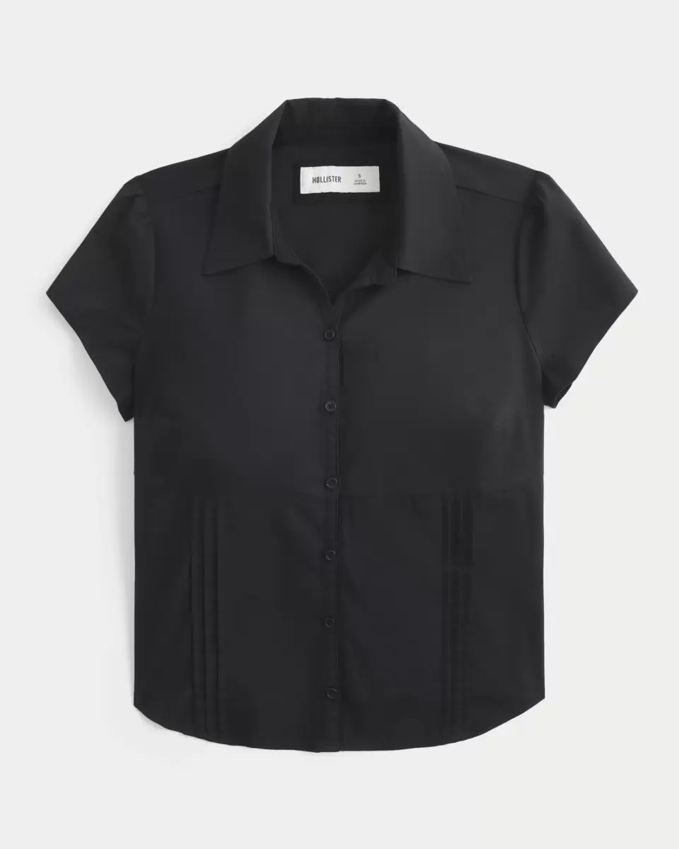 En 2000-inspirerad kortärmad skjorta med knappar i stretch-poplintyg, med pintuckveck och invändiga spetsdetaljer längs knappförslutningen. Knytdetalj baktill, ser perfekt ut klädd upp eller ner! Slim Fit. Importerad.