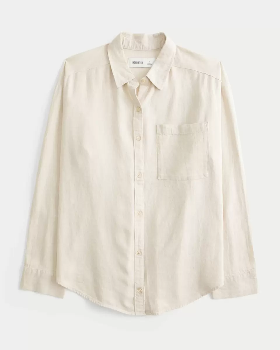 Din nya favoritskjorta är gjord i en mjuk linneblandning och är designad med hel knappstängning och vänster bröstficka. Böjd fåll, krage. Överdimensionerad passform. Importerad.