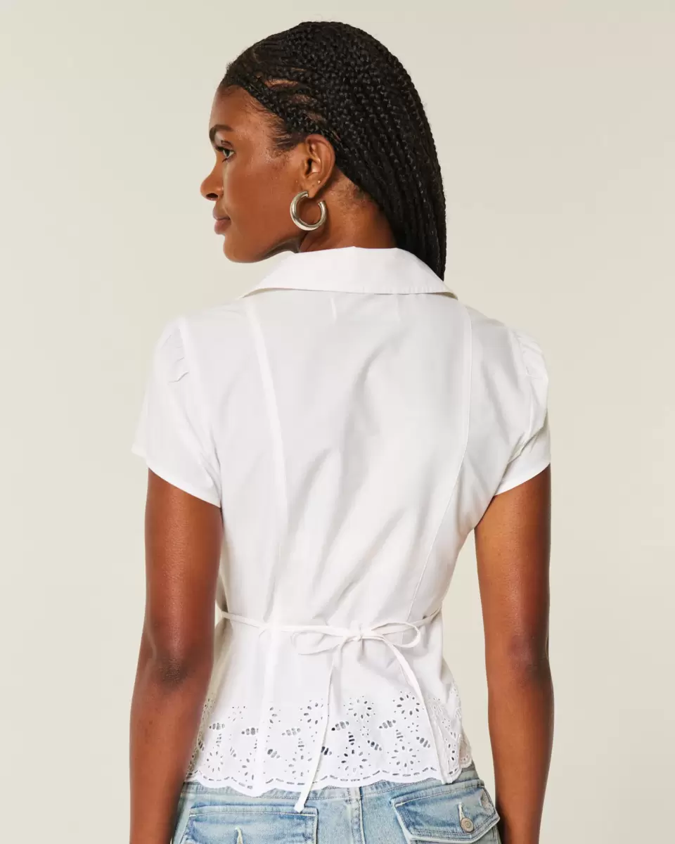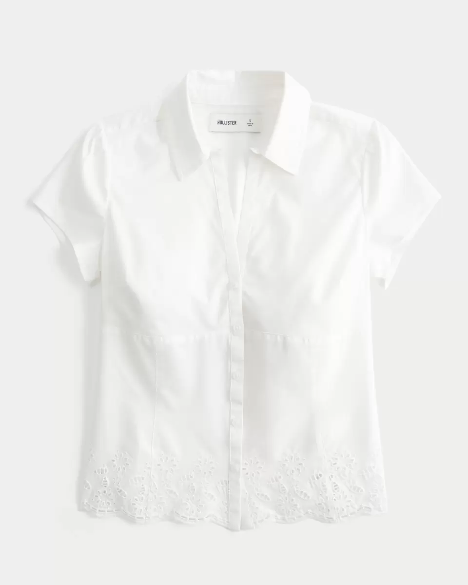 Denna mjuka, boho-inspirerade kortärmade skjorta har öljetter-broderier längs fållen. Krage, stretch poplintyg. Slim Fit. Importerad.
