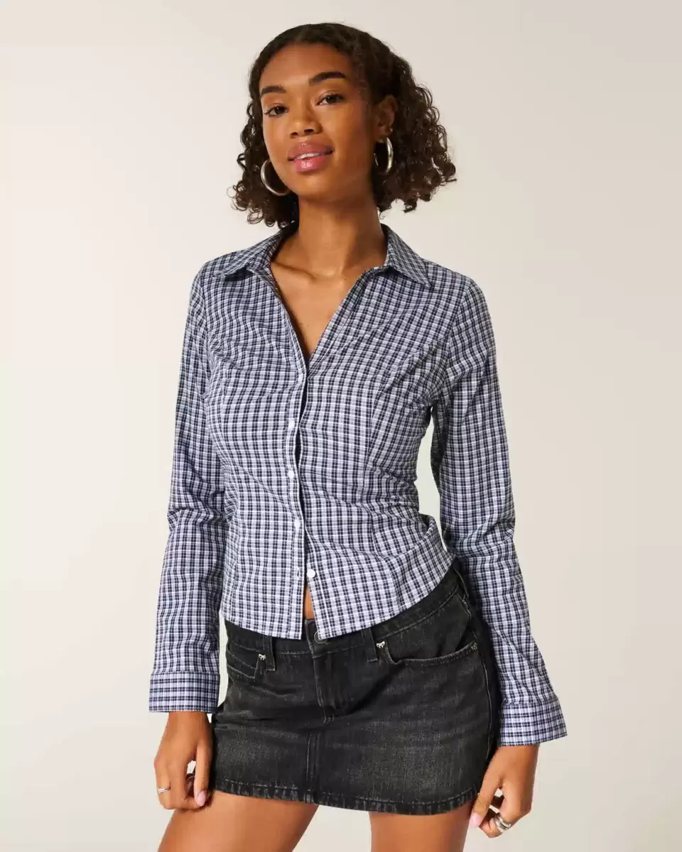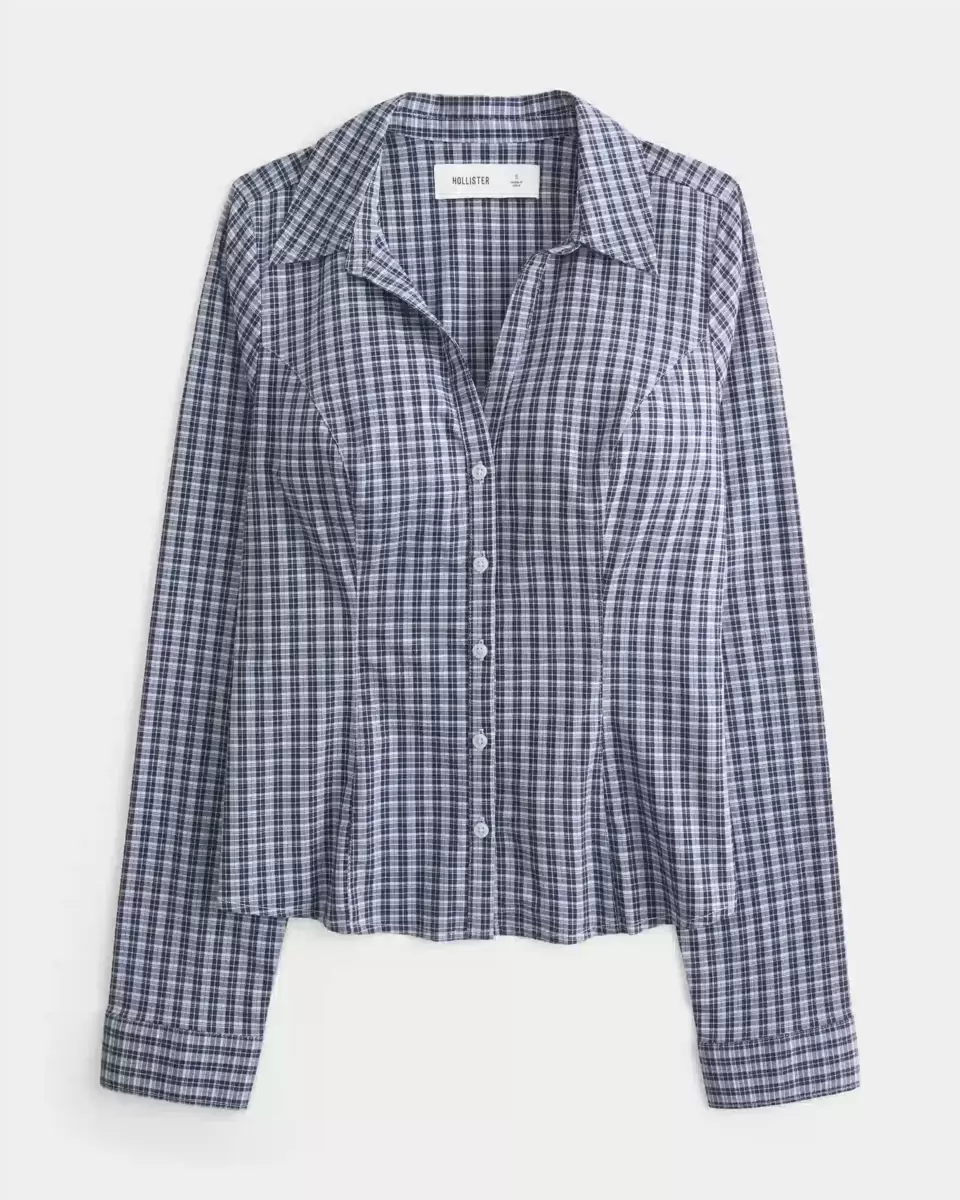 En Y2K-inspirerad, slimmad långärmad, stretchig poplinskjorta med krage, sömmar och justerbar knytband baktill. Hel knappstängning. Slim Fit. Importerad.