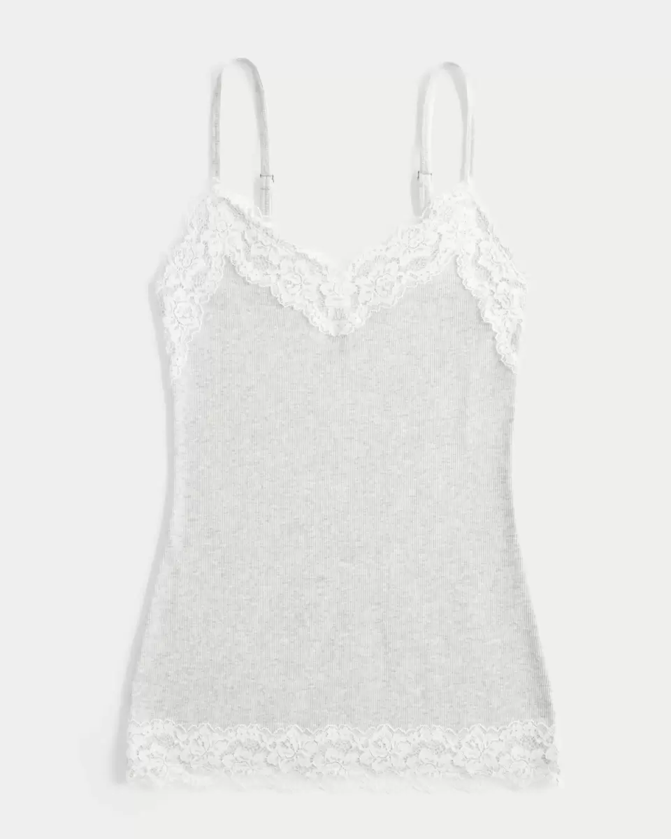 Vacker och supermjuk, denna Y2K-inspirerade cami har spetskanter vid halsen och fållen. Justerbara remmar. Slim Fit. Importerad.