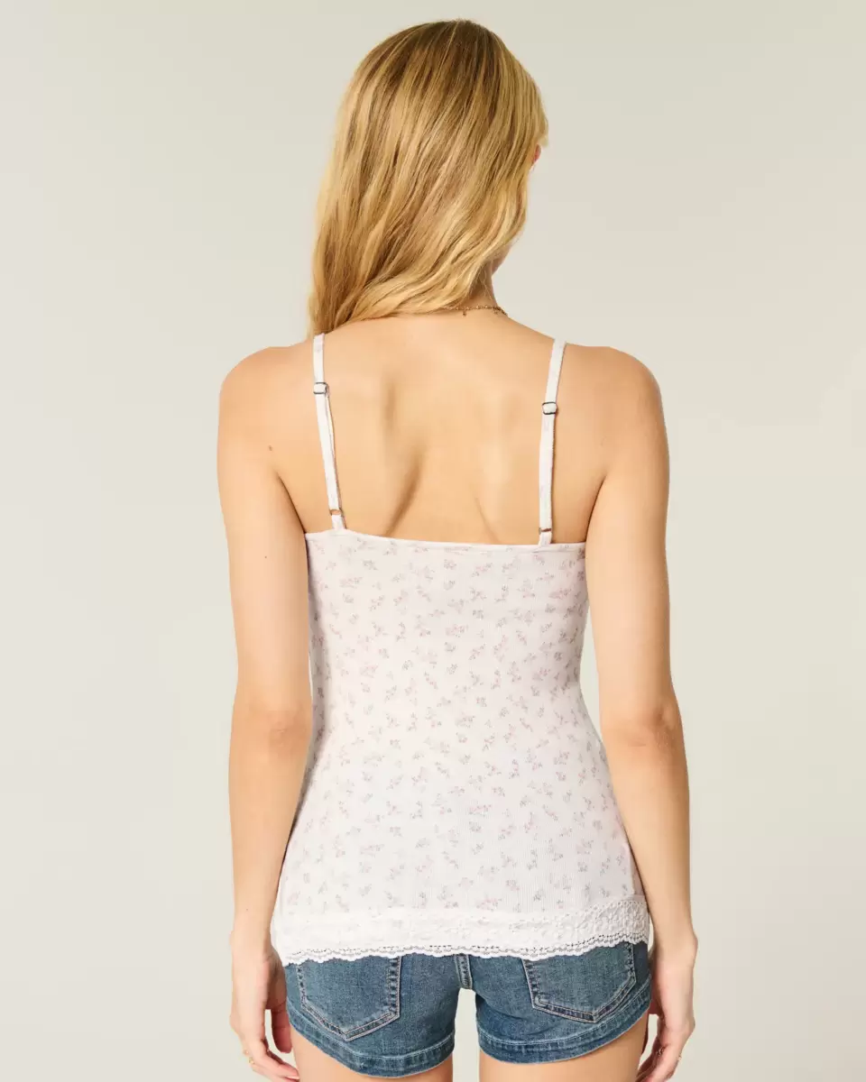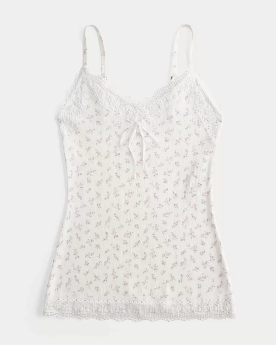 Vacker och supermjuk, denna Y2K-inspirerade cami har spetskanter vid halsen och fållen, plus en rosettdetalj i mitten av halsen. Justerbara remmar. Slim Fit. Importerad.