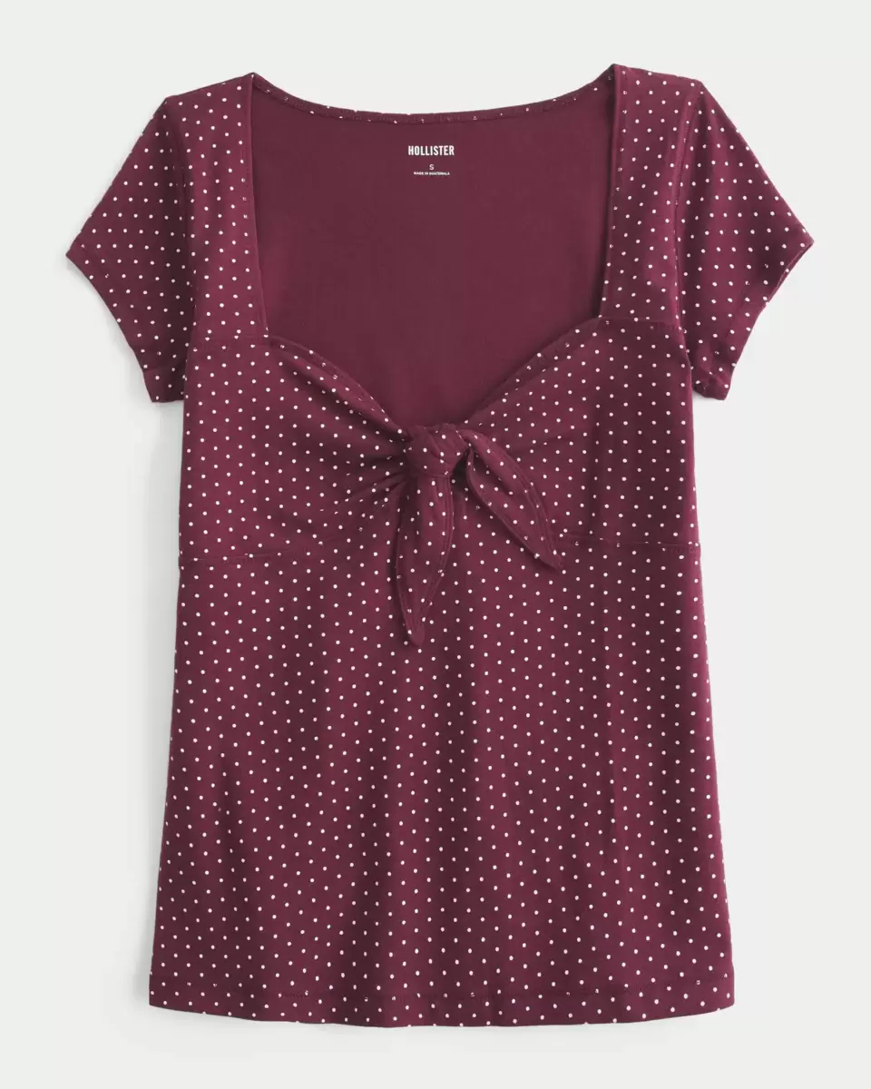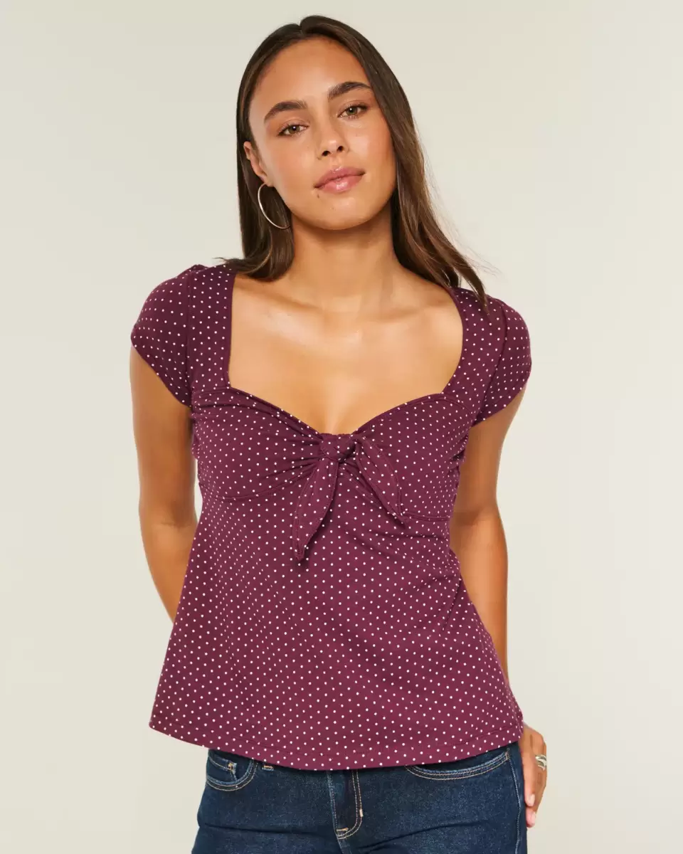 En flytande och supermjuk babydoll-topp med en söt knytdetalj vid bysten. Korta ärmar, längre längd. Easy Fit. Importerad.