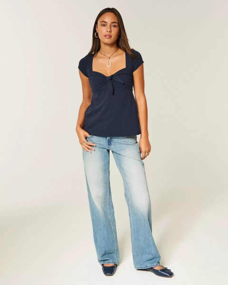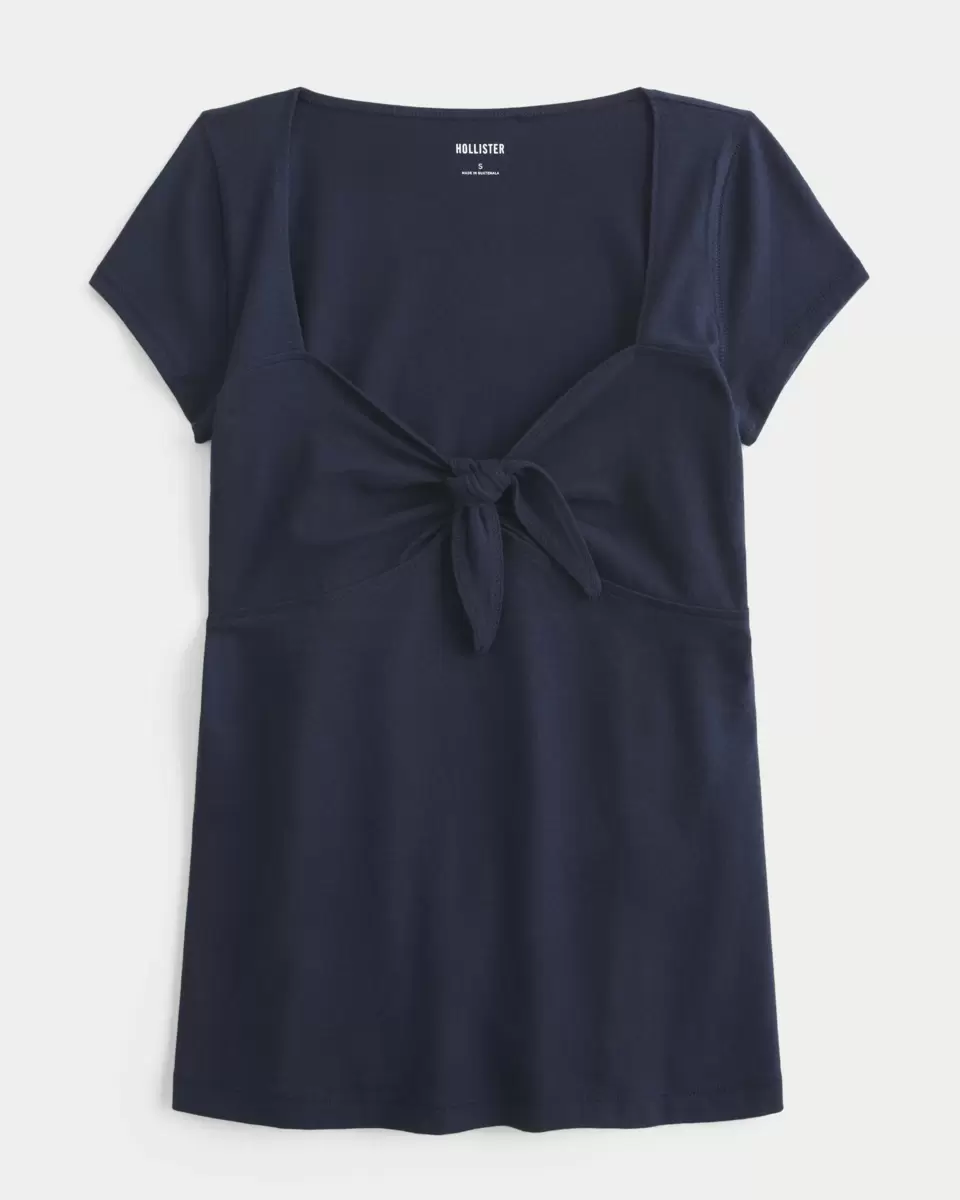 En flytande och supermjuk babydoll-topp med en söt knytdetalj vid bysten. Korta ärmar, längre längd. Easy Fit. Importerad.
