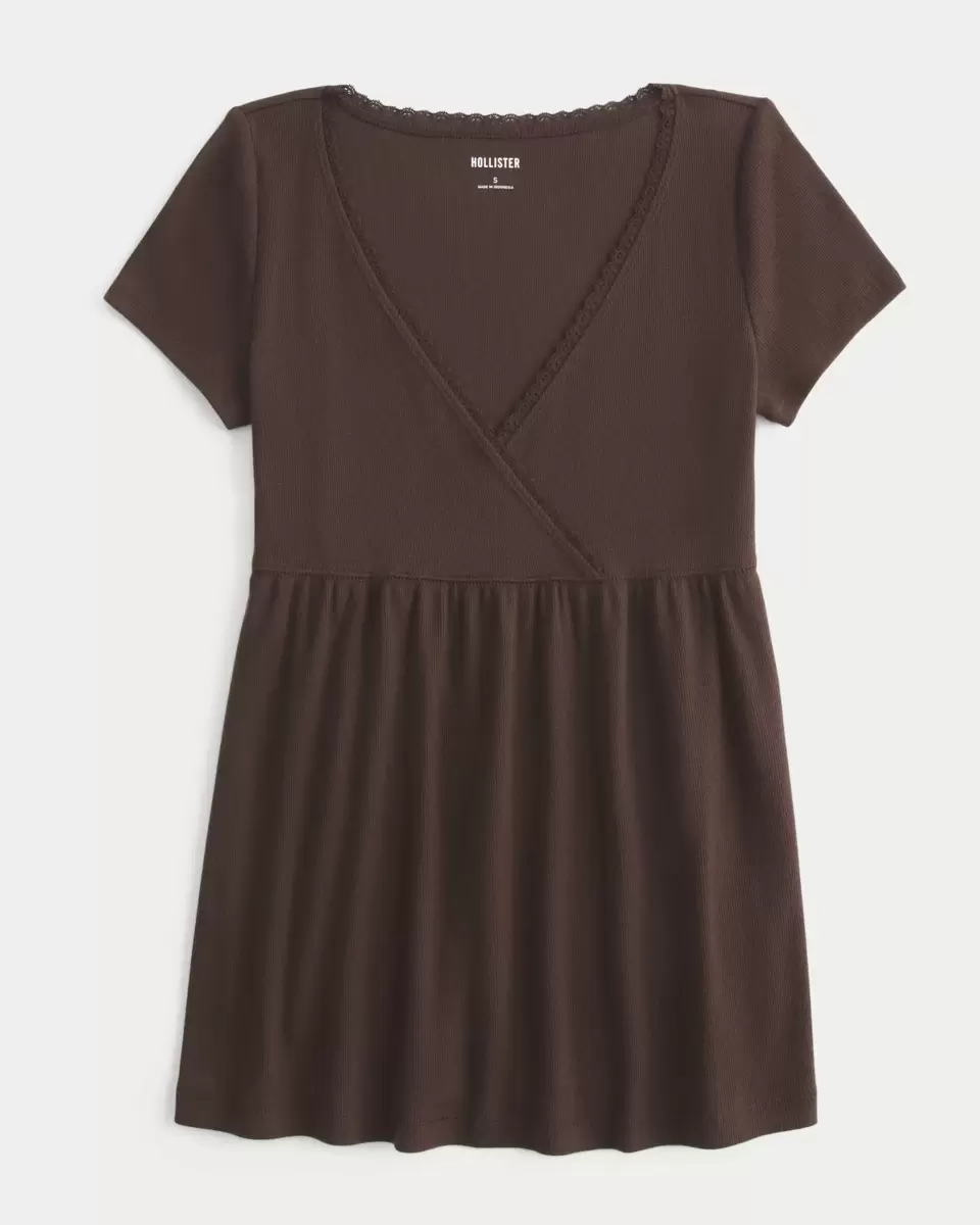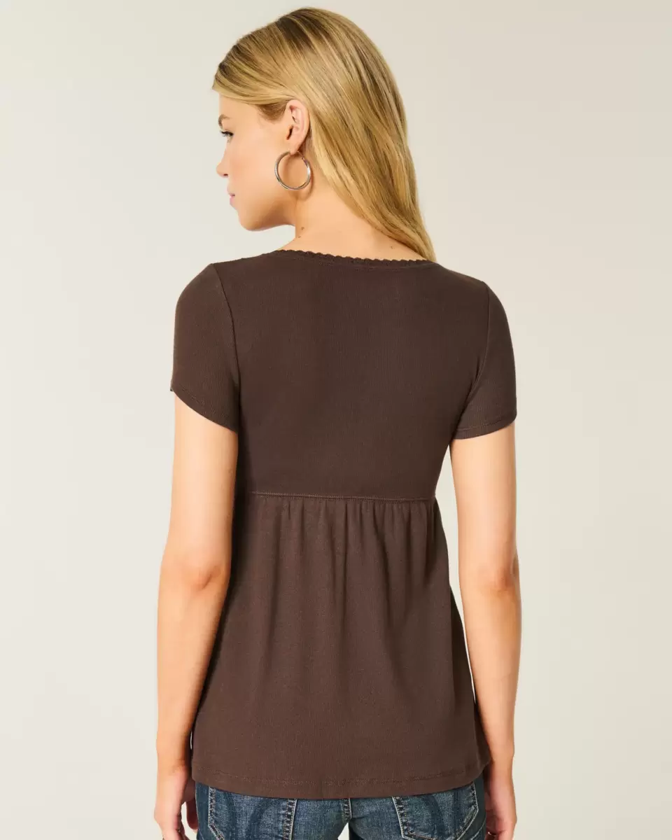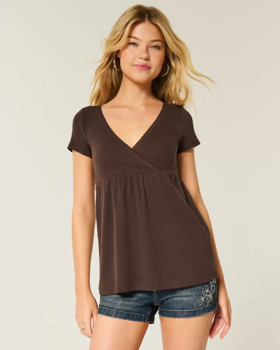 Nätt och supermjuk, denna kortärmade babydoll-topp har en v-ringning med spetskanter och en flytande fåll. Easy Fit. Importerad.