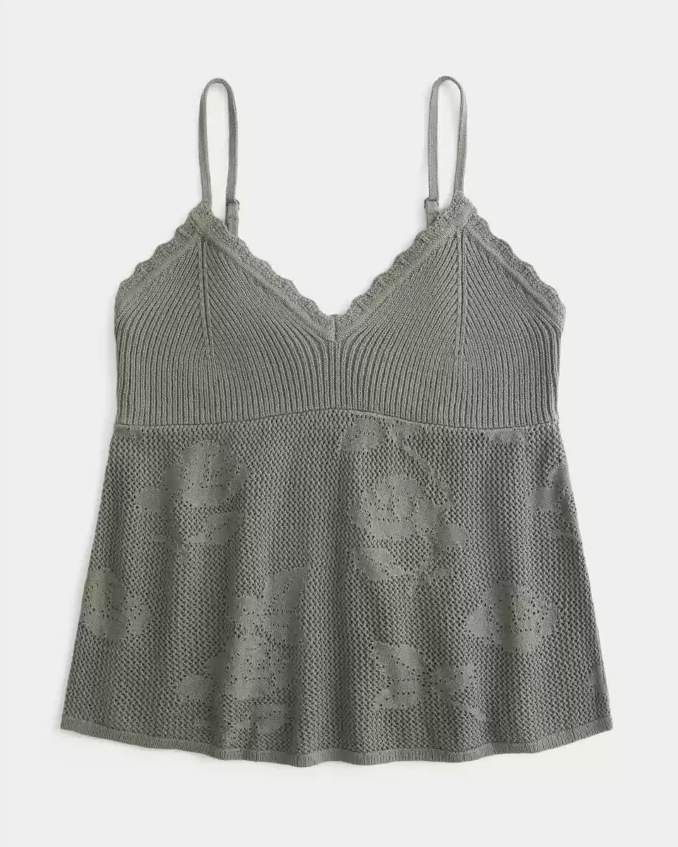 Flytig och supermjuk, denna cami har stickade detaljer i stickad stil och justerbara remmar. Söt babydoll siluett. Easy Fit. Importerad.