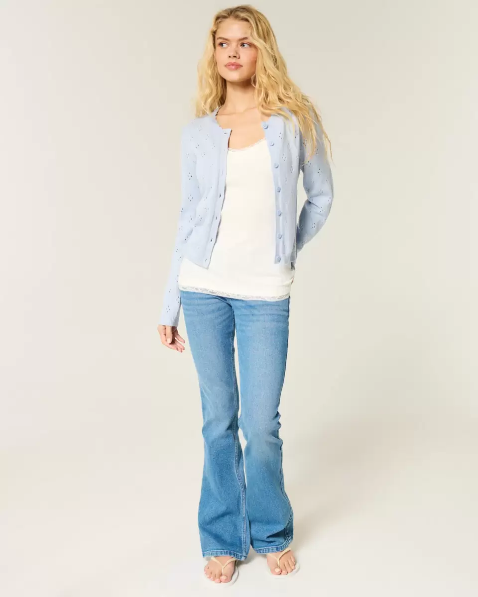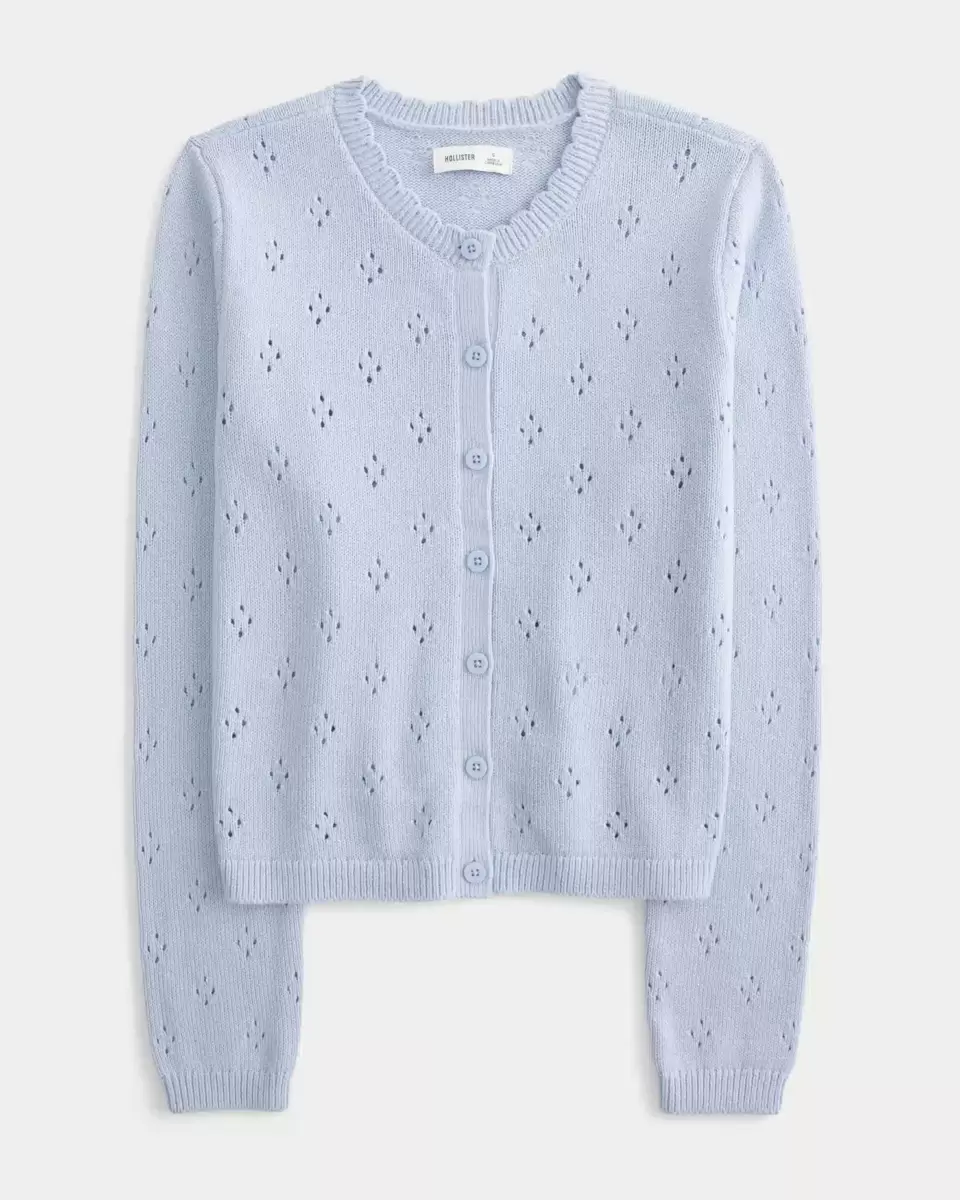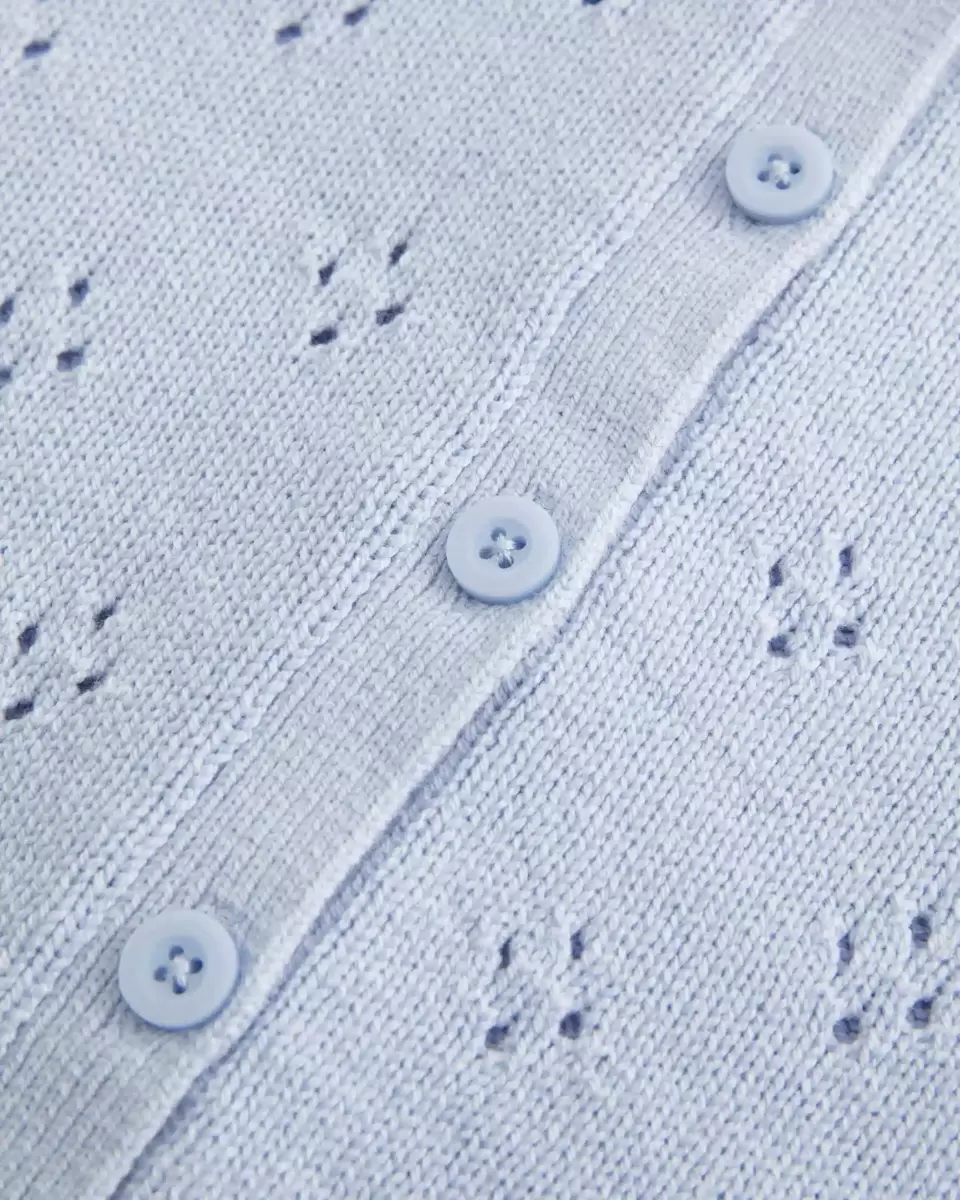 En mysig och supermjuk kofta med snygga öglormönster och en bågad rund halsringning. Hel knappstängning, ribbad kant, långa ärmar. Importerad.