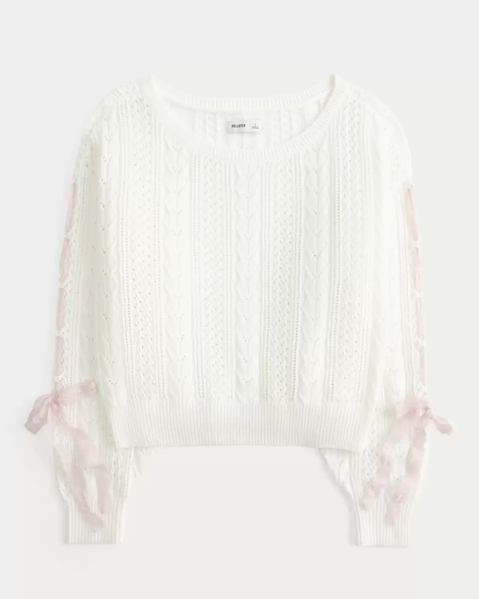 Den här supermjuka och mysiga tröjan har vackra spetsband genom ärmarna och kabelstickade mönster med öppen söm. Ribbstickade kanter, avslappnad halsringning, långa ärmar. Importerad.