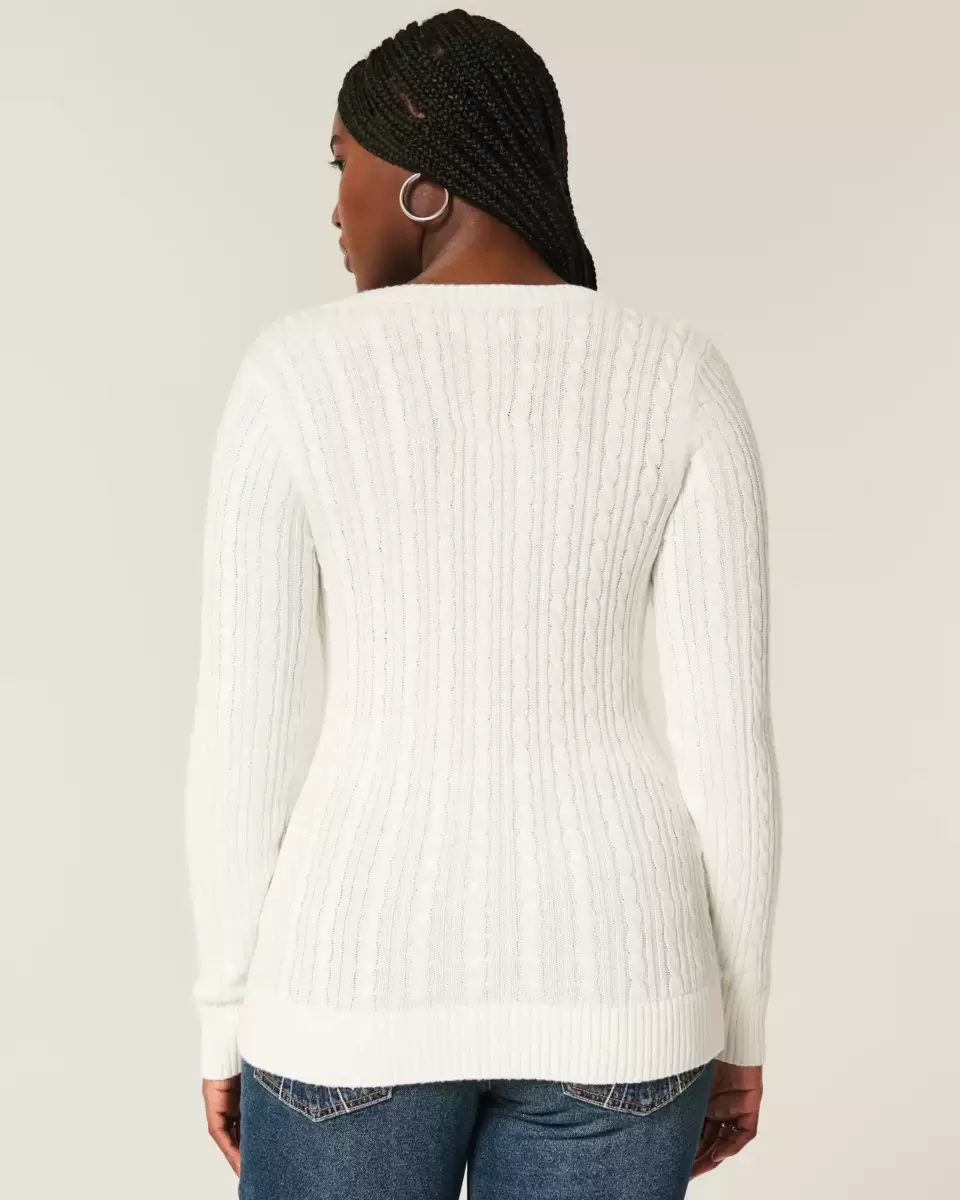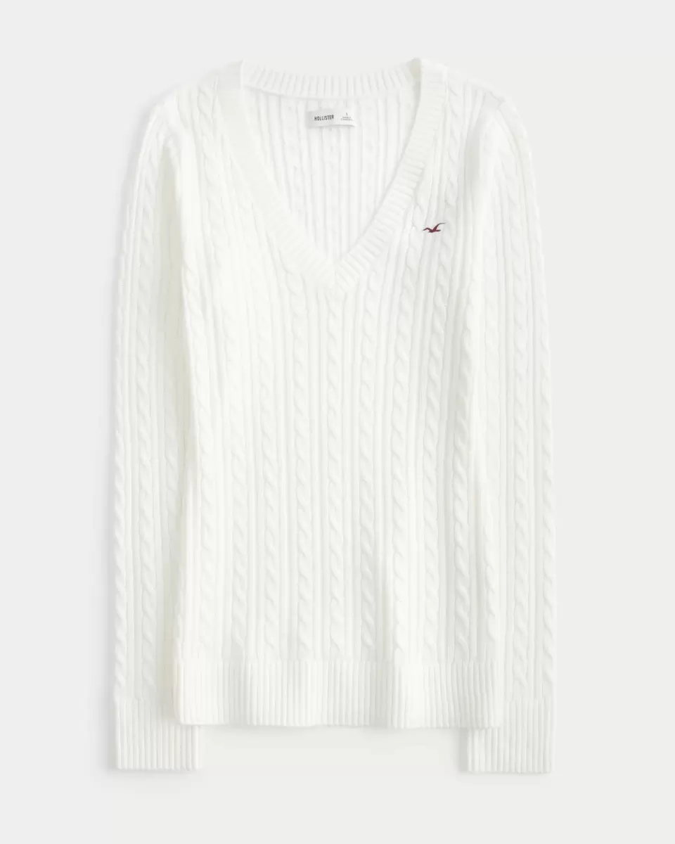 En supermjuk och mysig tröja med klassiska kabelstickade mönster och en broderad logotyp på vänster bröst. V-ringning, ribbad kant, längre längd, långa ärmar. Slim Fit. Importerad.