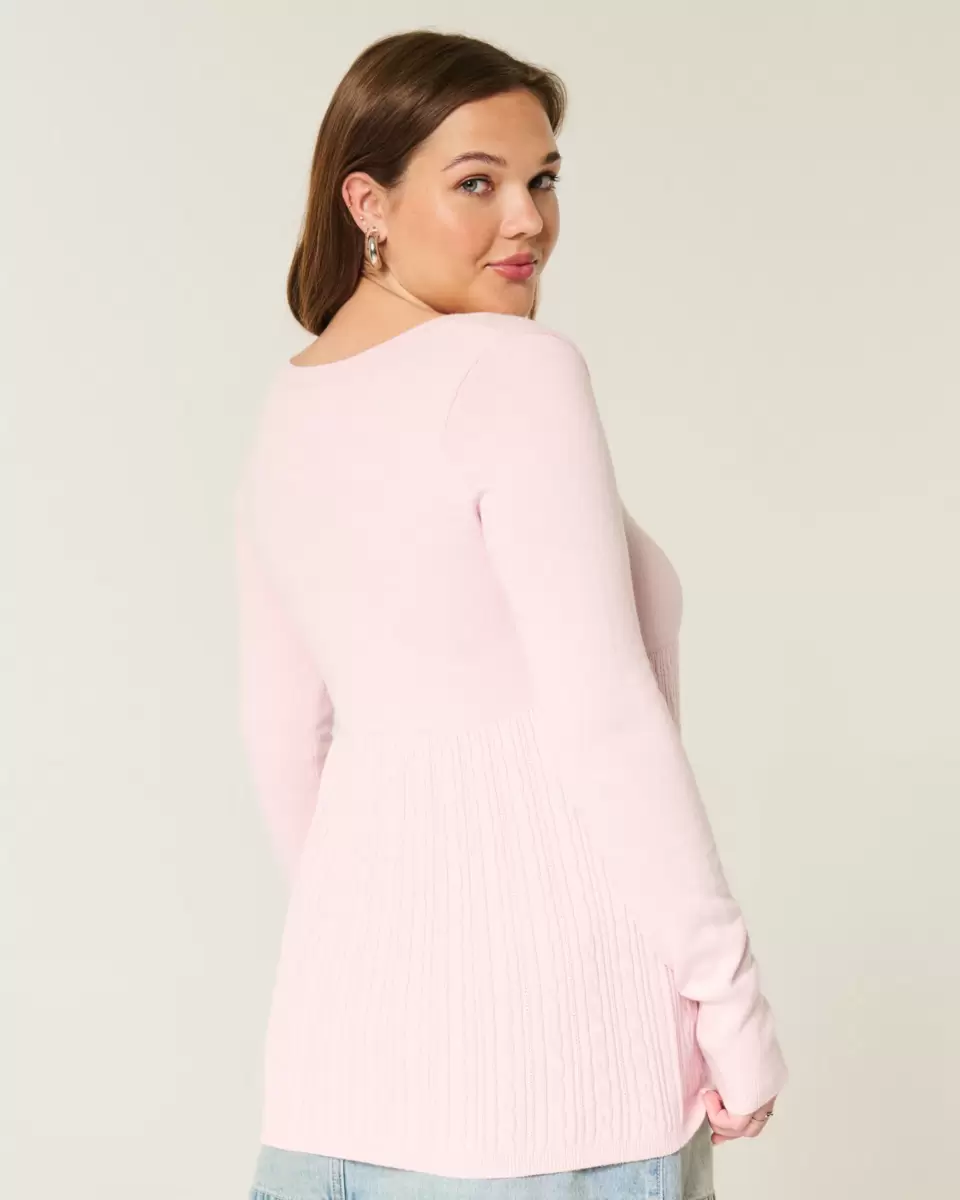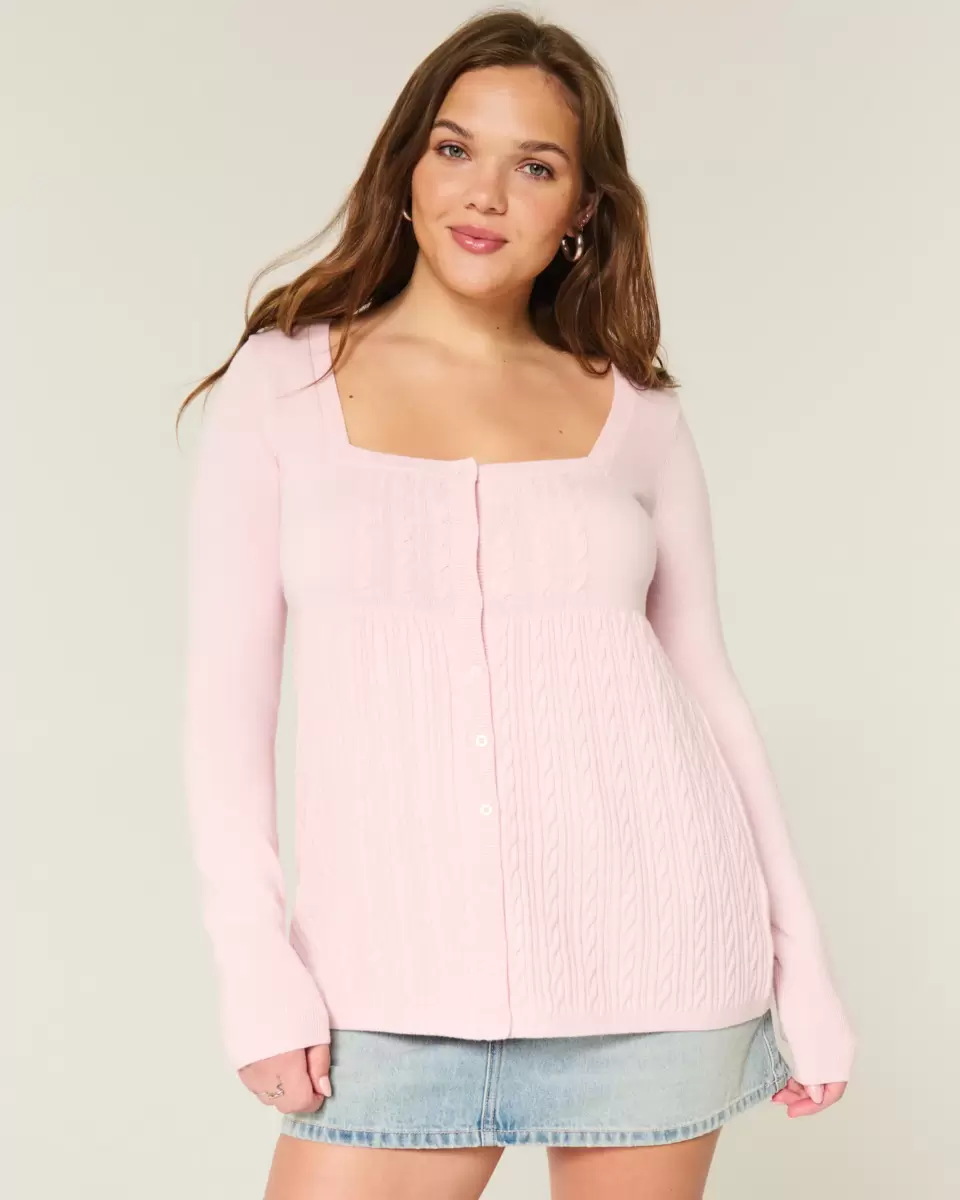 Den här långärmade tröjan är perfekt för lager med en cami eller ensam, designad med en fyrkantig halsringning och en söt Y2K-inspirerad babydoll-siluett. Knappstängning fram, kabel-k