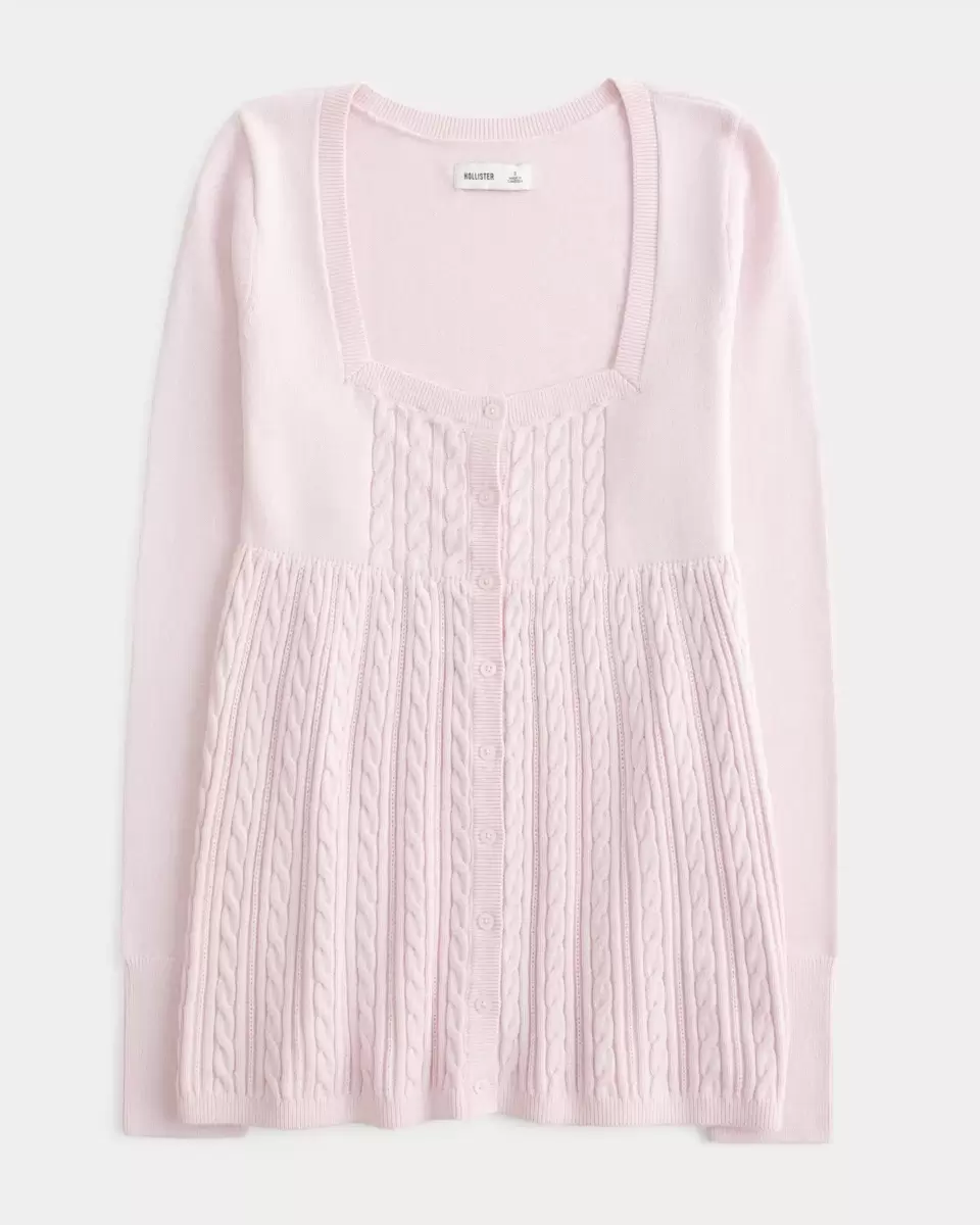 Den här långärmade tröjan är perfekt för lager med en cami eller ensam, designad med en fyrkantig halsringning och en söt Y2K-inspirerad babydoll-siluett. Knappstängning fram, kabelstickade mönster, längre längd. Easy Fit. Importerad.