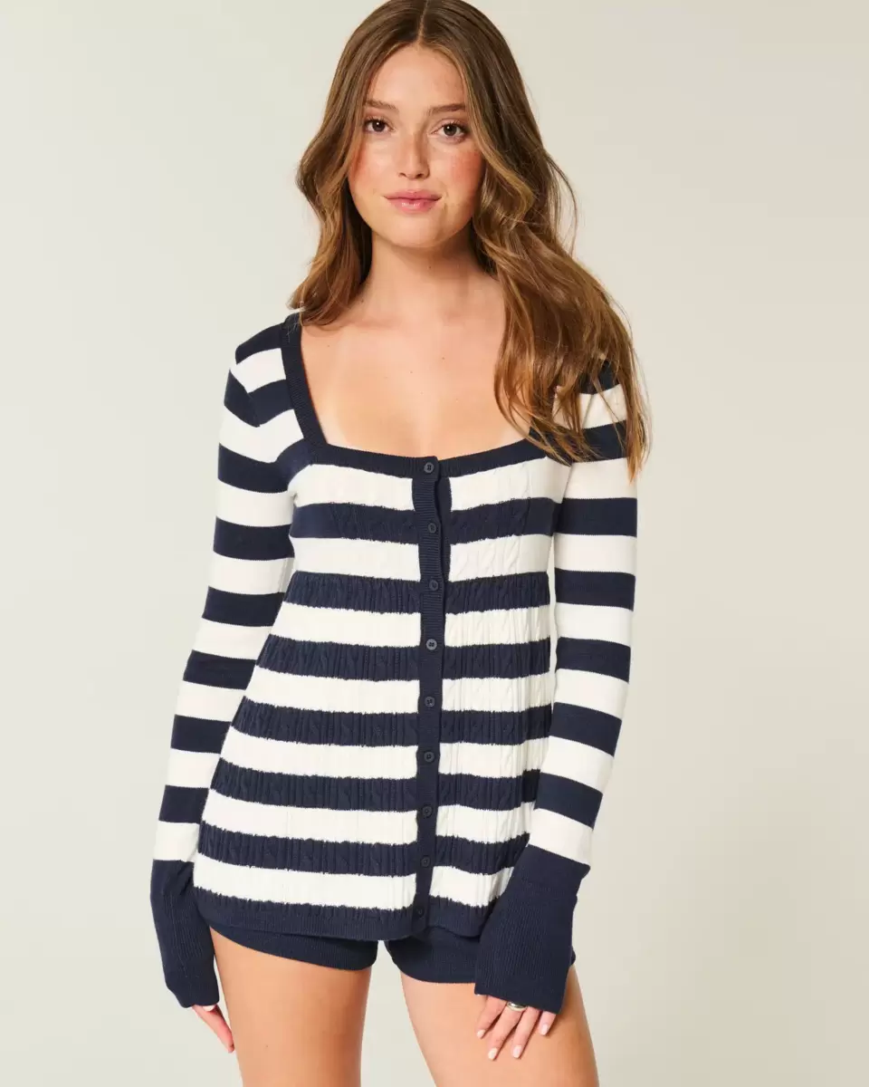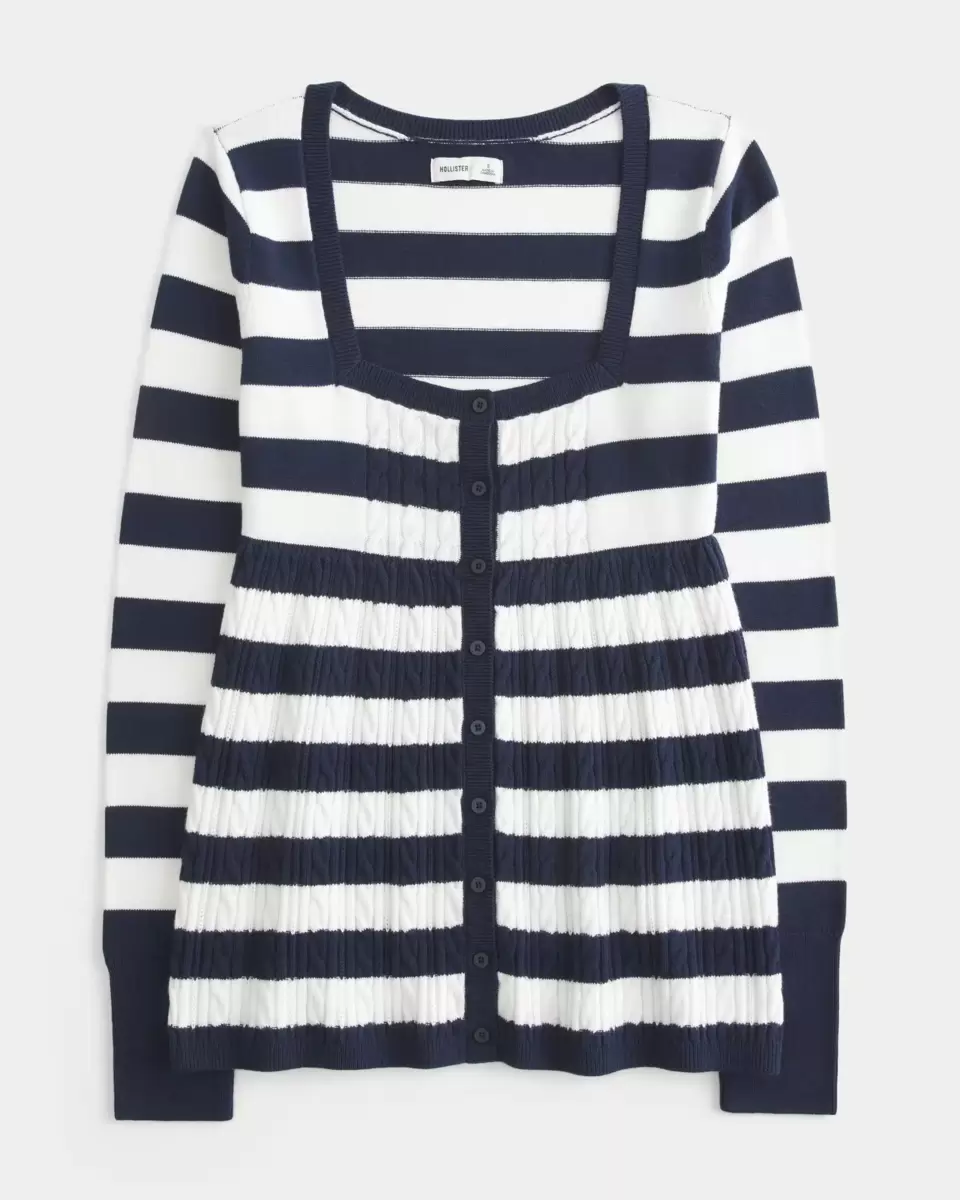 Den här långärmade tröjan är perfekt för lager med en cami eller ensam, designad med en fyrkantig halsringning och en söt Y2K-inspirerad babydoll-siluett. Knappstängning fram, kabelstickade mönster, längre längd. Easy Fit. Importerad.