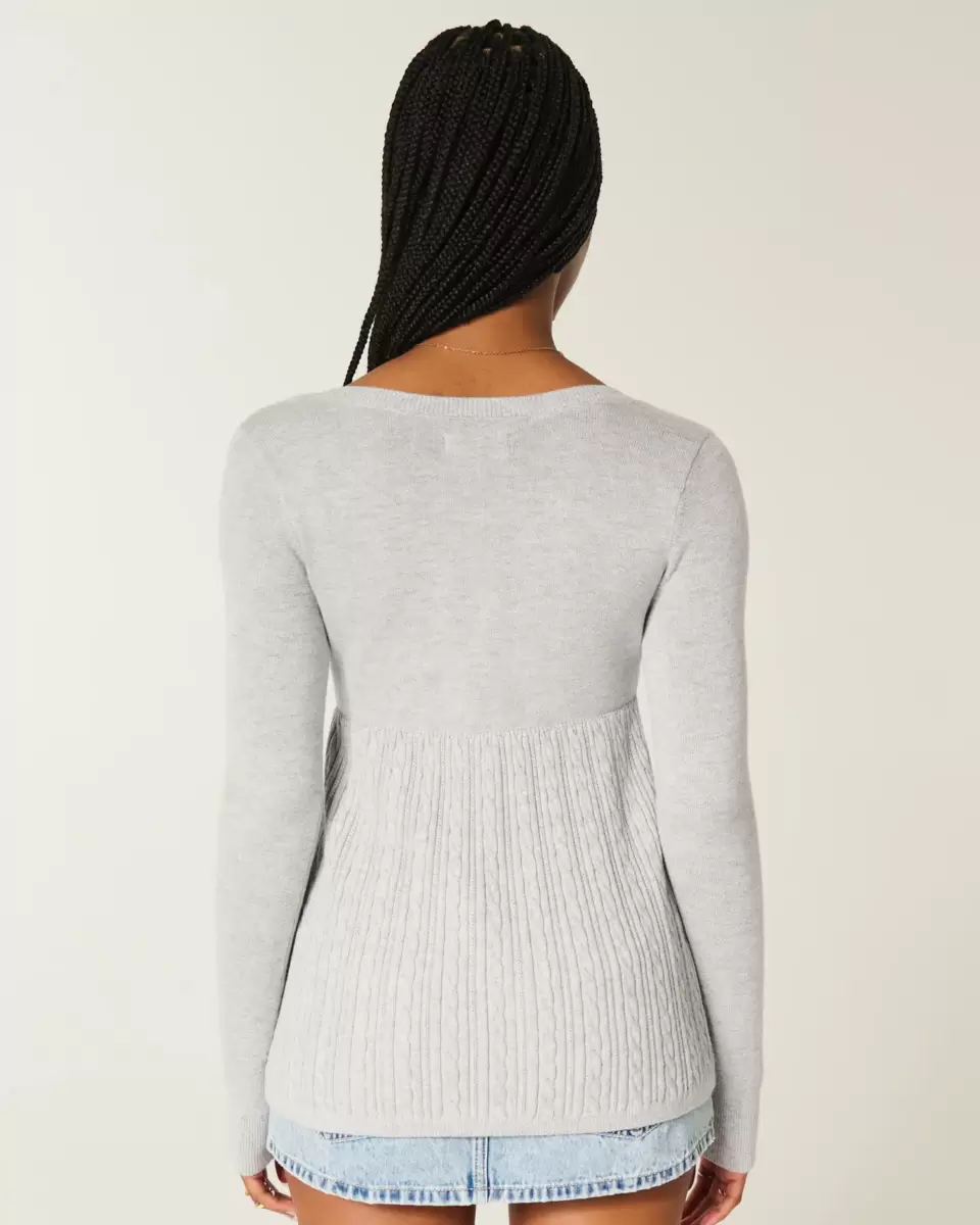 Den här långärmade tröjan är perfekt för lager med en cami eller ensam, designad med en fyrkantig halsringning och en söt Y2K-inspirerad babydoll-siluett. Knappstängning fram, kabelstickade mönster, längre längd. Easy Fit. Importerad.