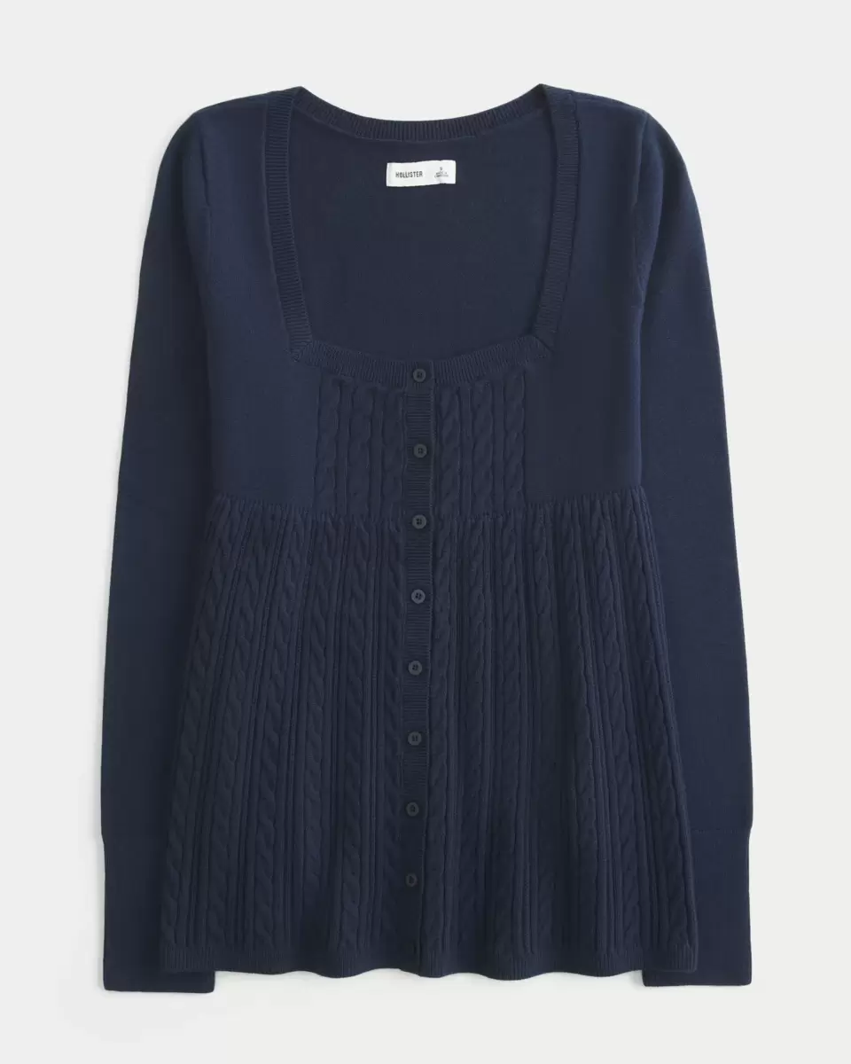 Den här långärmade tröjan är perfekt för lager med en cami eller ensam, designad med en fyrkantig halsringning och en söt Y2K-inspirerad babydoll-siluett. Knappstängning fram, kabelstickade mönster, längre längd. Easy Fit. Importerad.