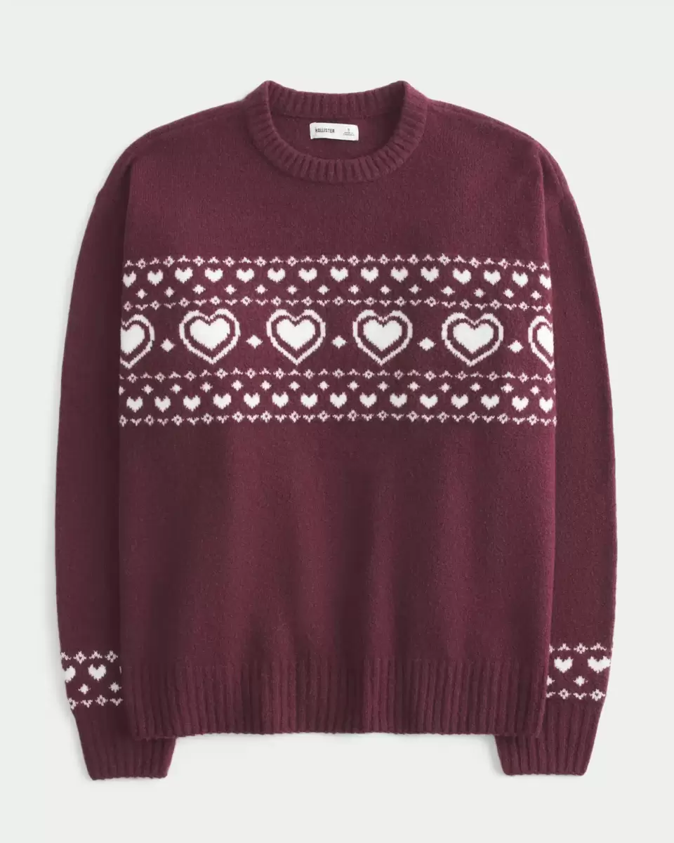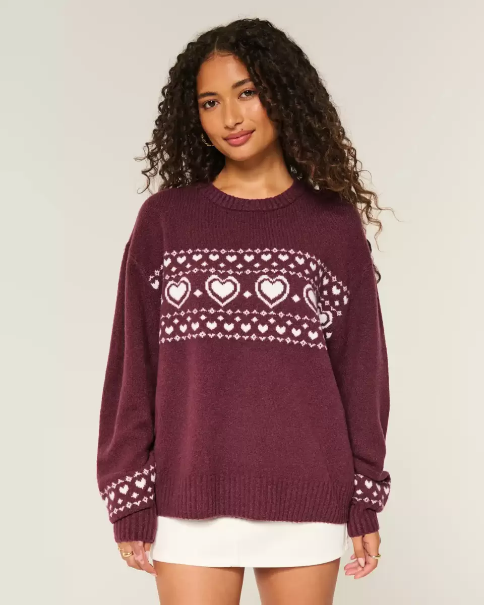 En supermjuk och mysig stickad tröja med ett klassiskt hjärtmönster. Rund halsringning, långa ärmar, ribbad kant. Överdimensionerad passform. Importerad.