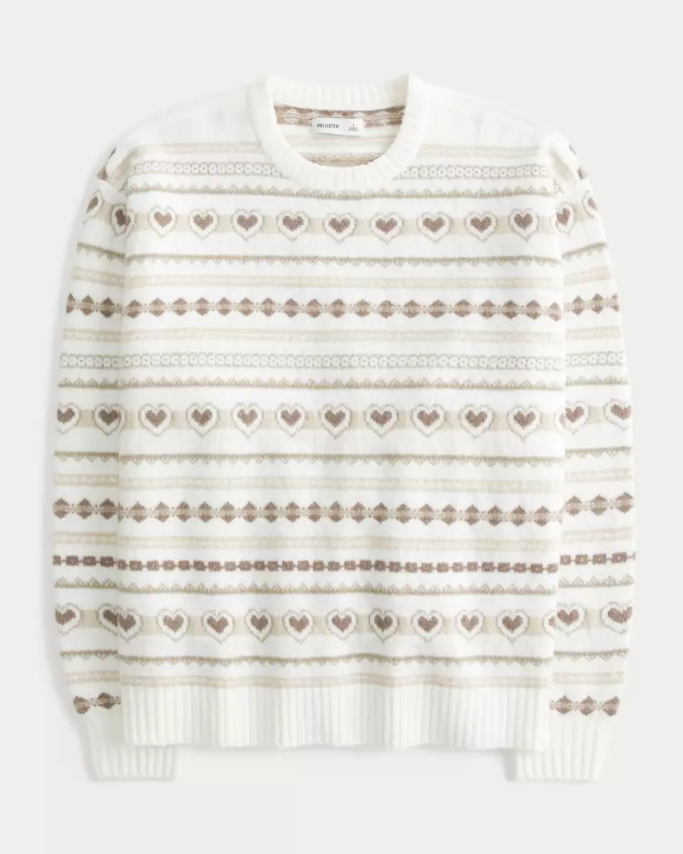 En supermjuk och mysig stickad tröja med ett klassiskt hjärtmönster. Rund halsringning, långa ärmar, ribbad kant. Överdimensionerad passform. Importerad.