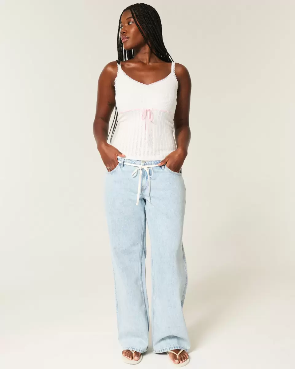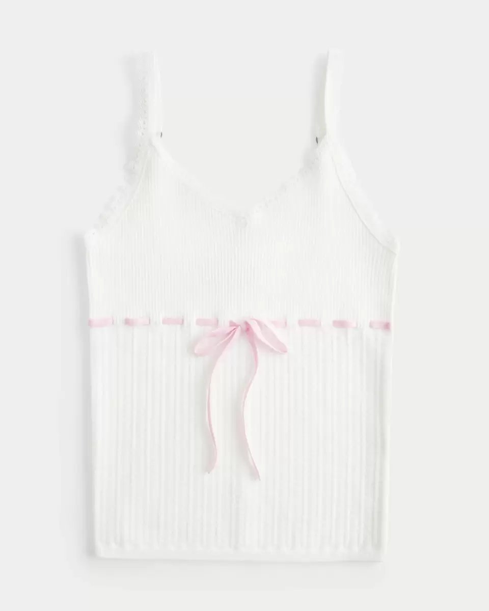 En vacker tröjastickad tank med mysig struktur, med en vacker knytdetalj. Bågad kant längs halsen. Importerad.