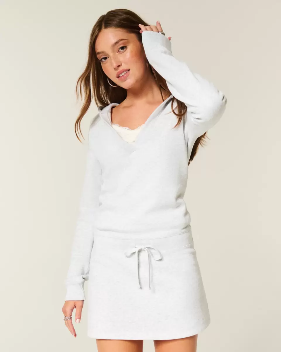 Bekväm och supermjuk, den här fleeceklänningen har v-ringning och dragsko i midjan. Långa ärmar, huva. Importerad.