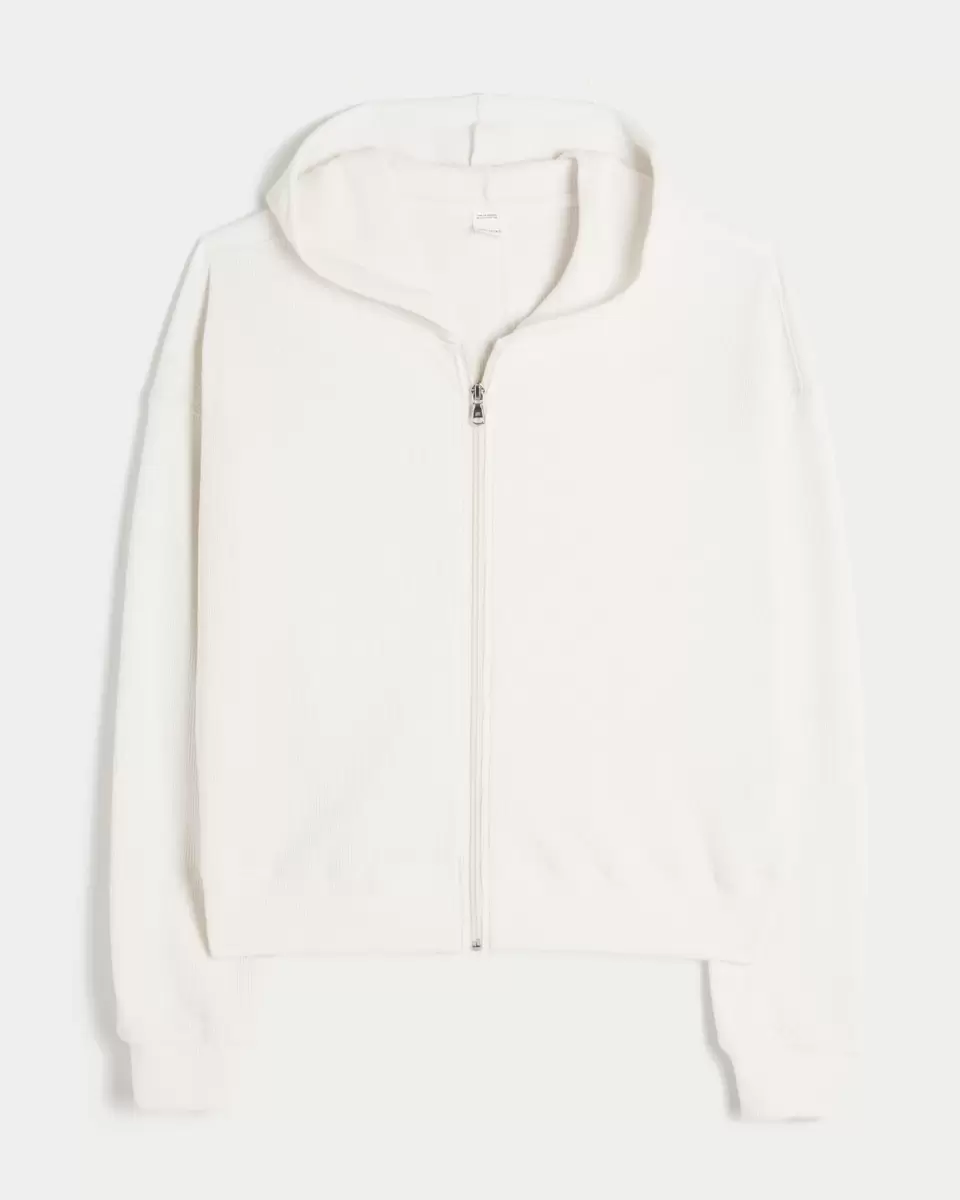 En supermjuk huvtröja i mysigt våffeltyg, med hel dragkedja. Långa ärmar, huva. Importerad.