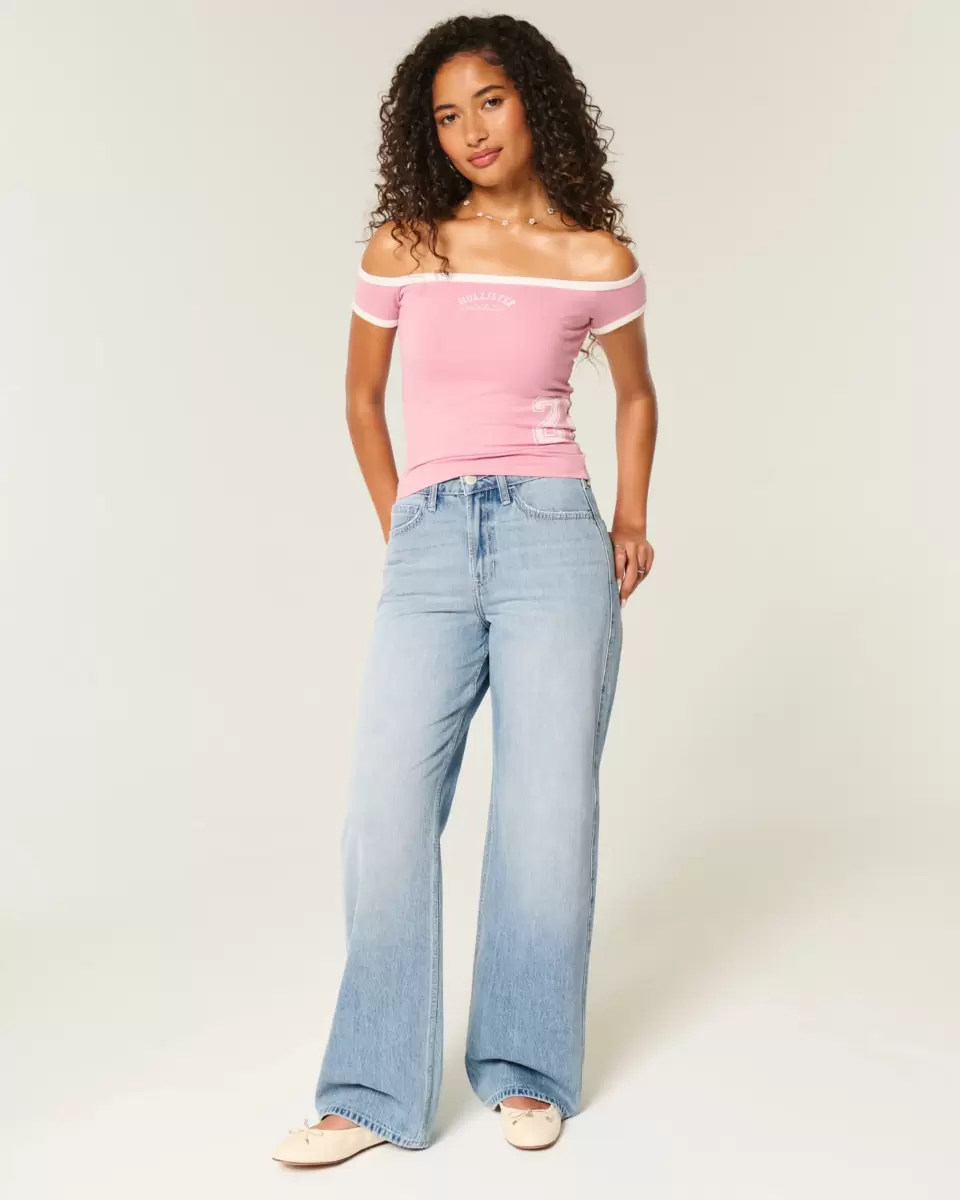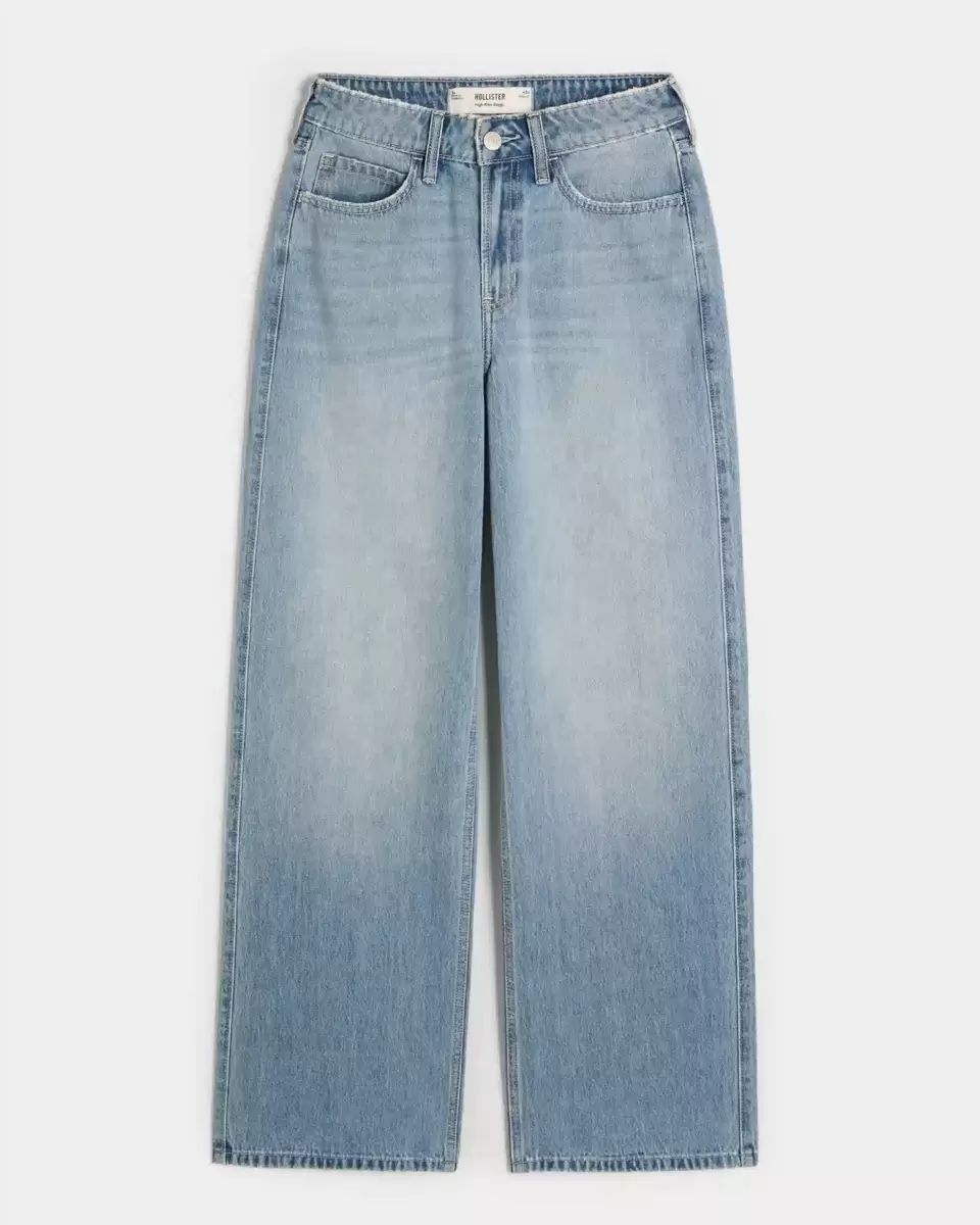 Bekväma denimjeans designade med en smickrande hög midja och baggy ben. Medium tvätt med blekning och morrhår. Importerad.