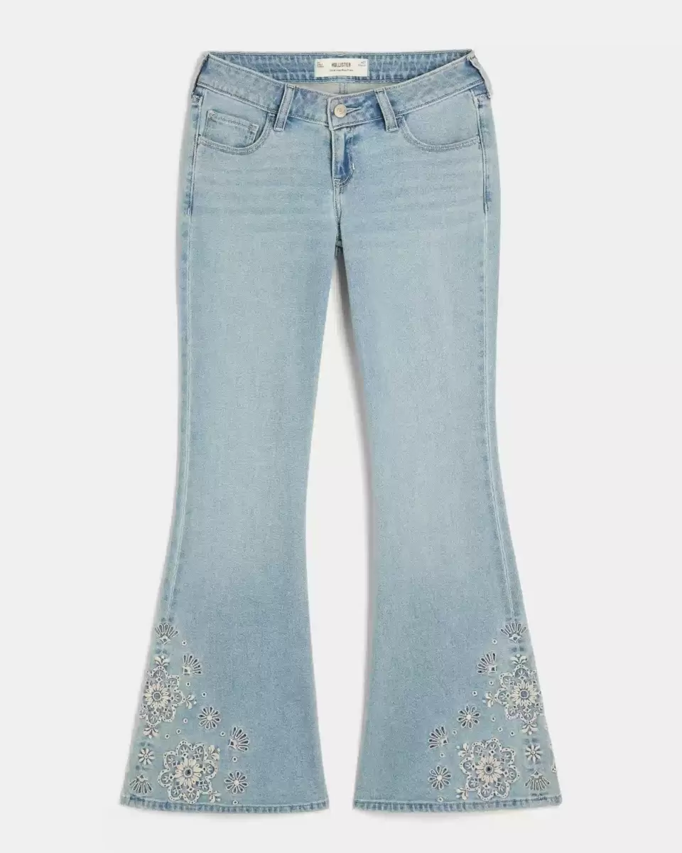 Bekväma jeans i Vintage Stretch-denim, designade med en ultralåg midja och utsvängd fåll. Lätt tvätt med blekning och morrhår, öljettbroderade blomdetaljer vid fållen. Importerad.
