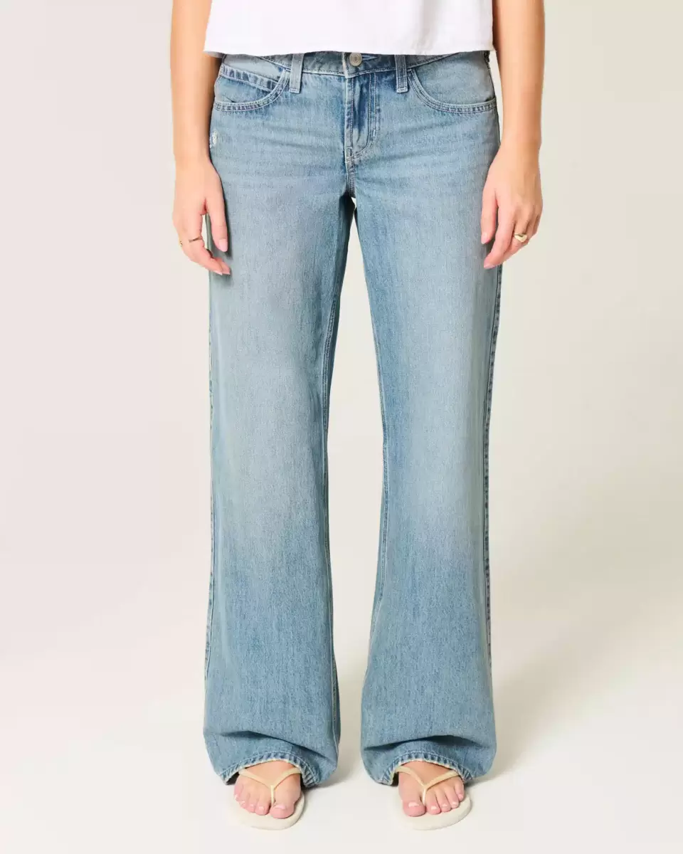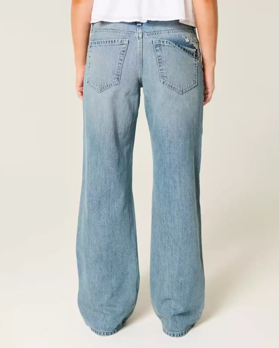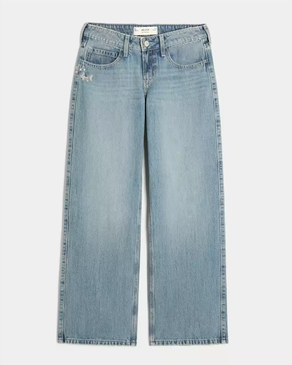 Bekväma jeans i medium tvätt, designade med säckiga ben och smickrande låg midja. Broderad fjärilsgrafik på höger sida och bakficka. Vikbar bakfickadetalj, blekning, morrhår. Importerad.
