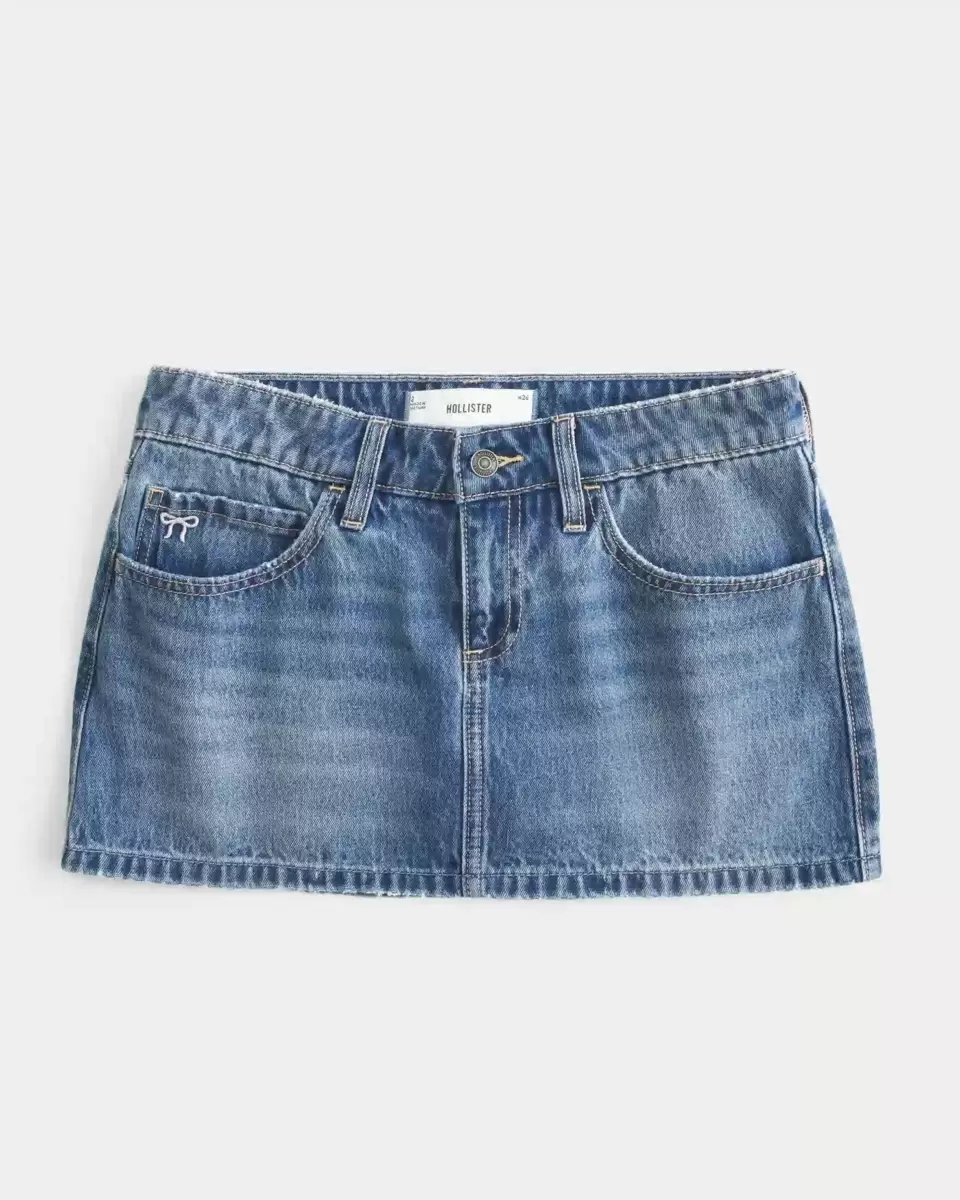 Ett sött minikort i denim designat med en låg midja och dolda stickade shorts. Blekning, morrhår, rosa rosett och hjärtbroderi längs bakfickorna, broderad rosettdetalj vid höger myntficka. Medium tvätt. Importerad.