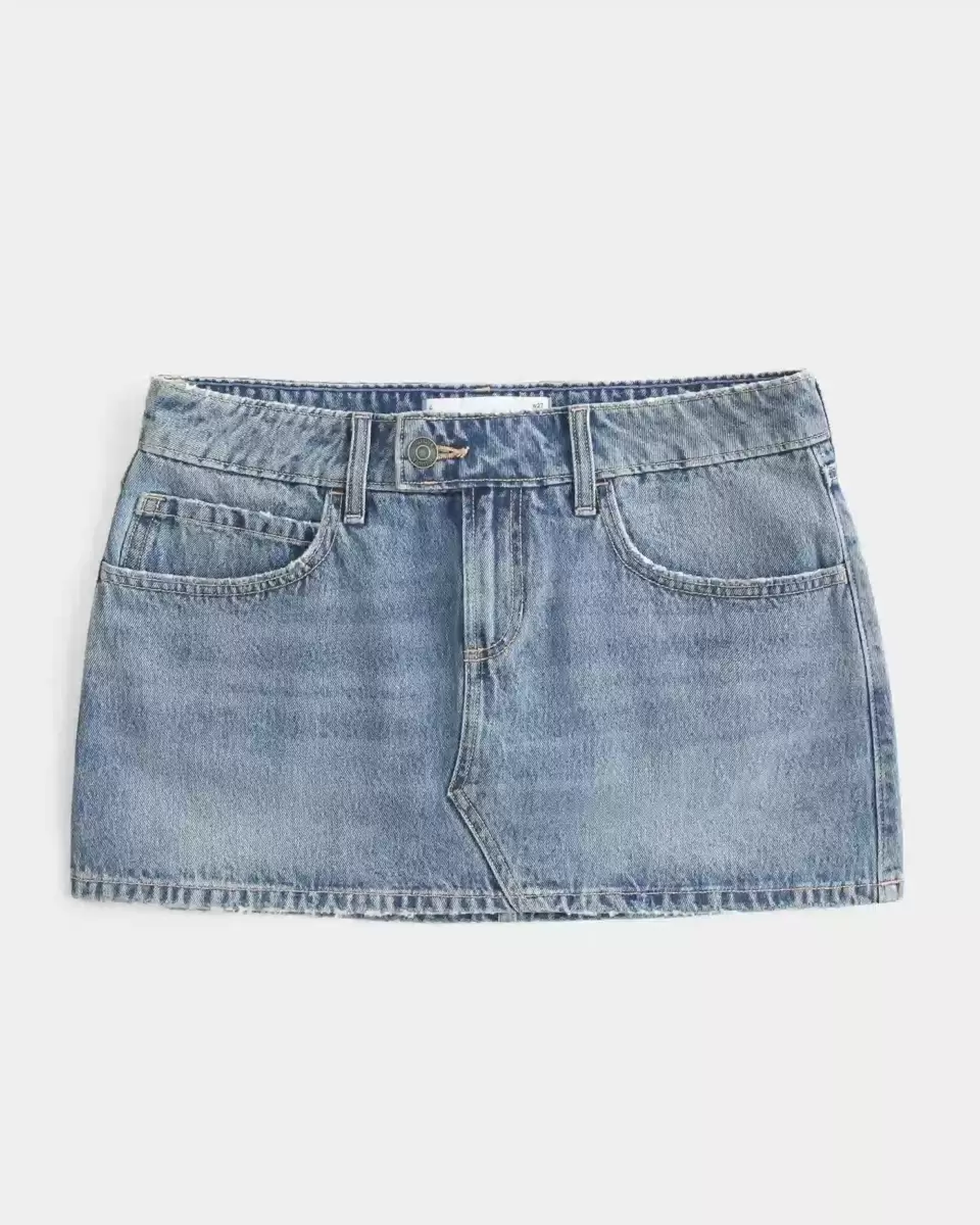 Ett sött minikort i denim designat med en låg midja och dolda stickade shorts. Medium tvätt med blekning och morrhår. Importerad.