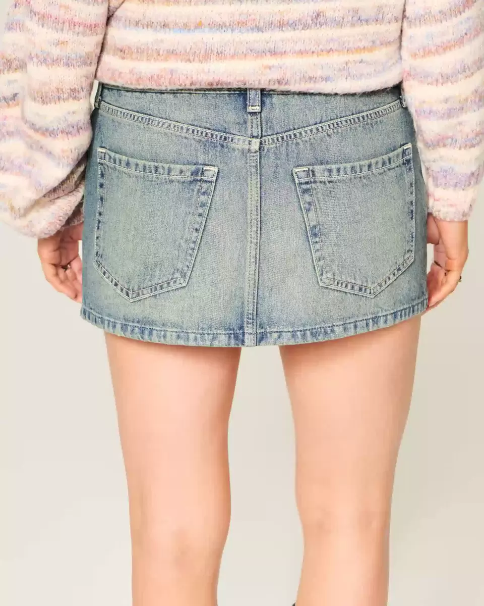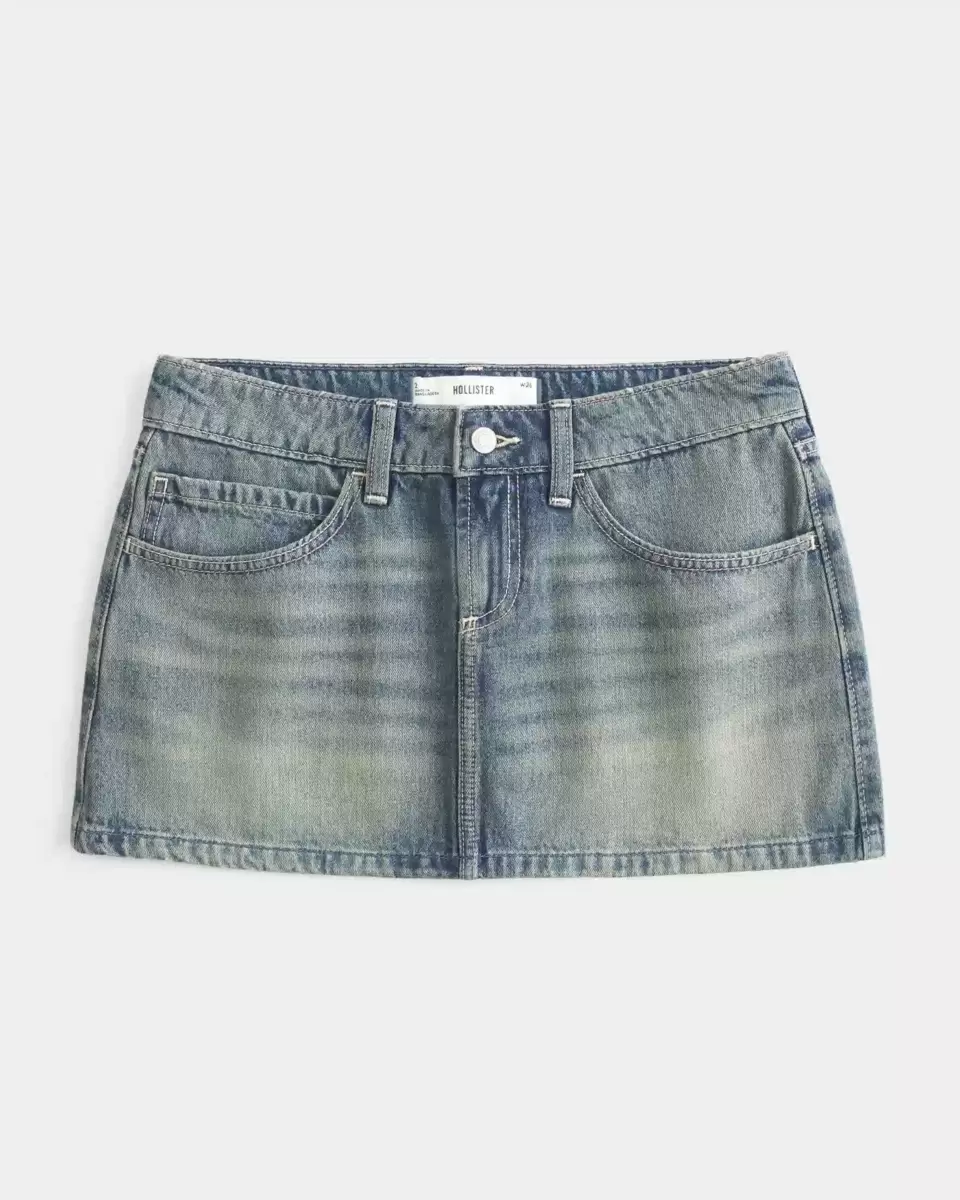 En söt och bekväm minikjol i jeans med blekning och morrhår. Låg midja. Importerad.