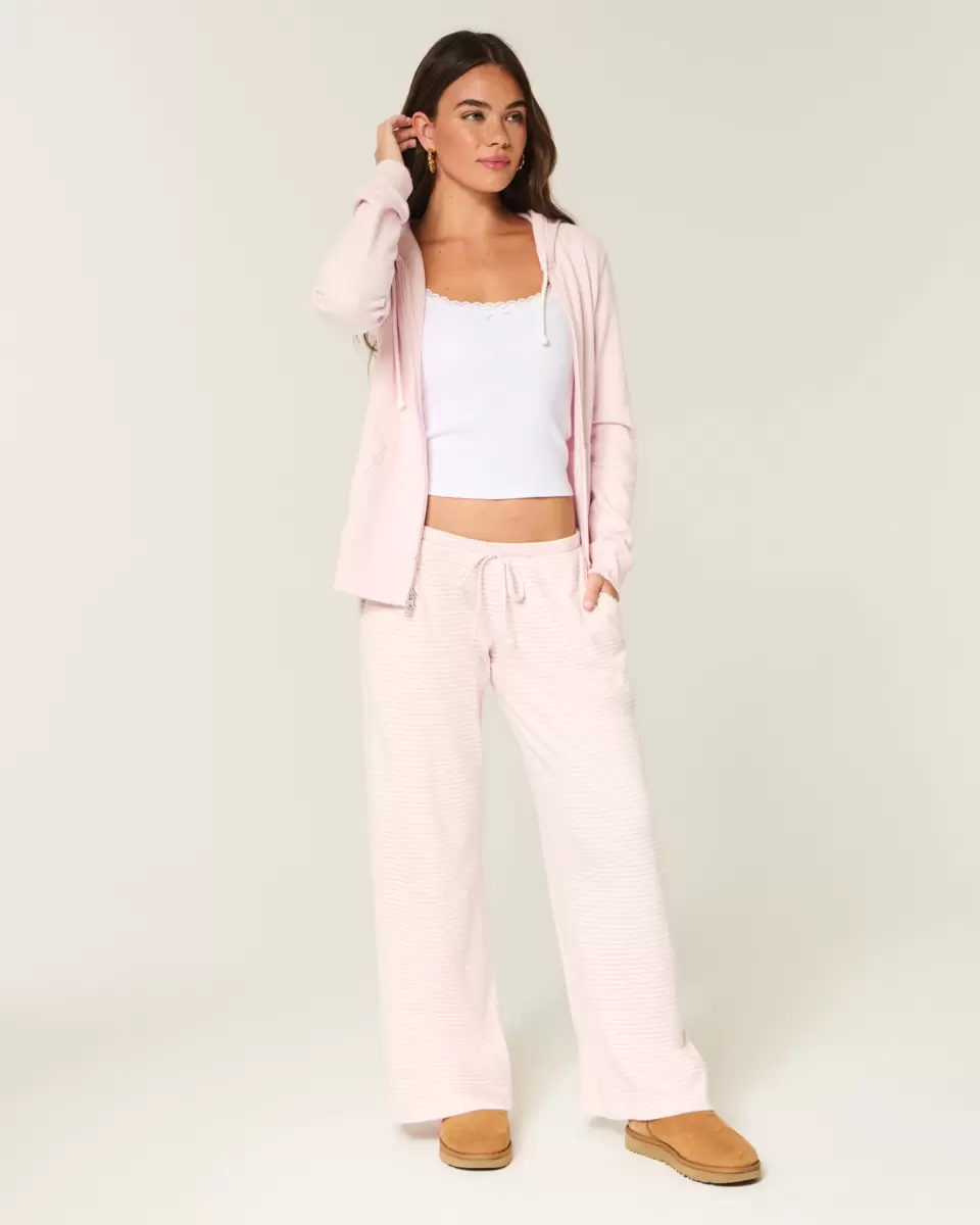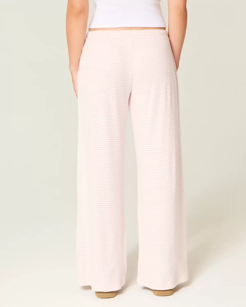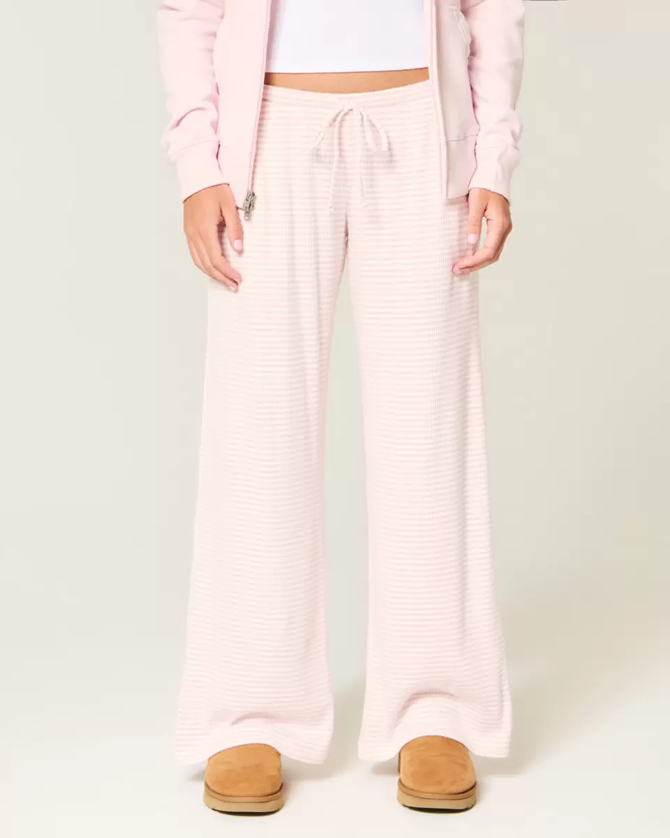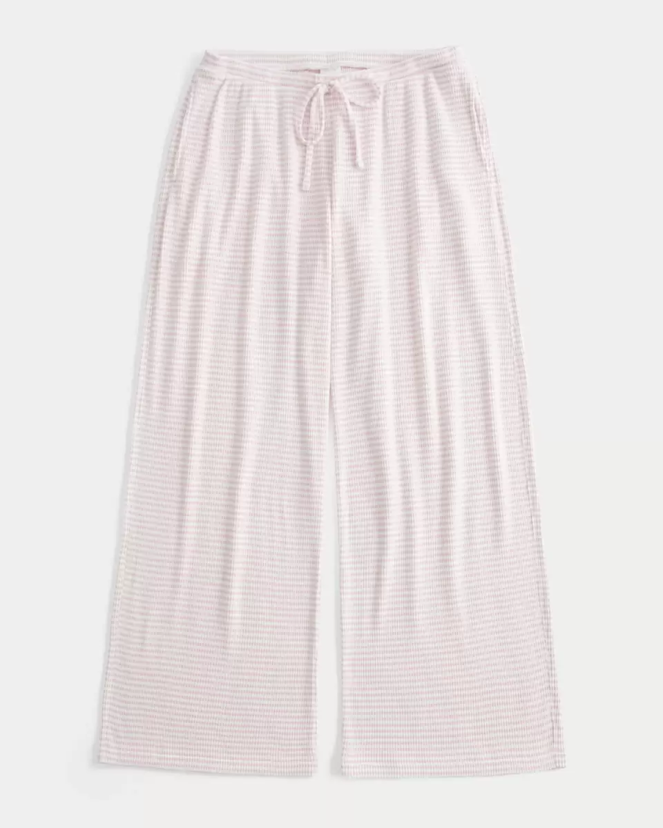 Supersöta och bekväma byxor med vida ben i mysigt ribbad tyg. Dragsko i midjan, fickor. Importerad.