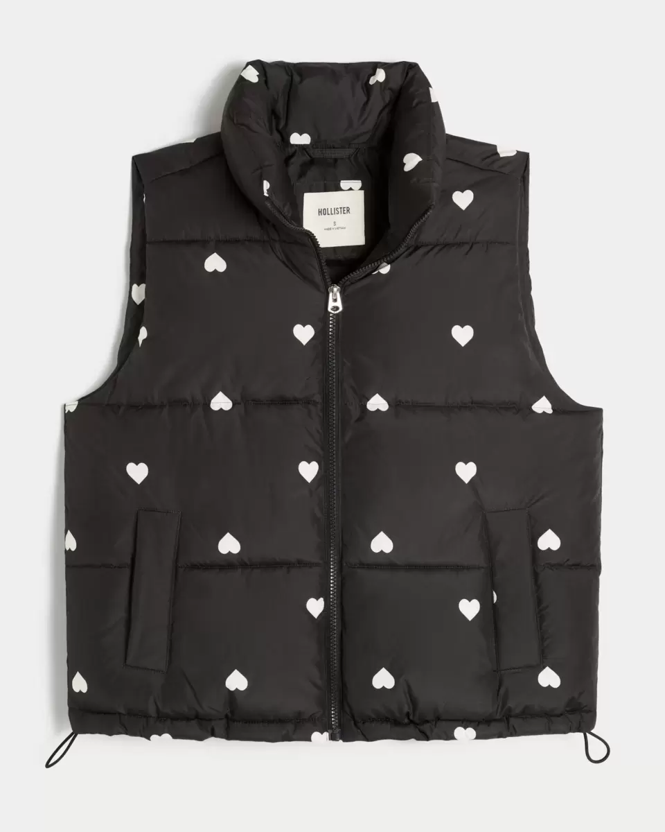 Denna mysiga pufferväst har ett heltäckande hjärtmönster och stängs med dragkedja. Dragsko i fåll, quiltade kanaler, mock-neck krage, fickor. Importerad.