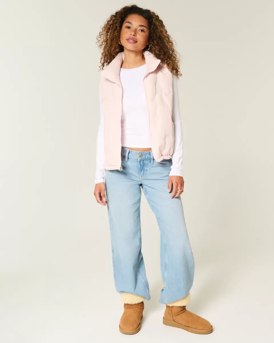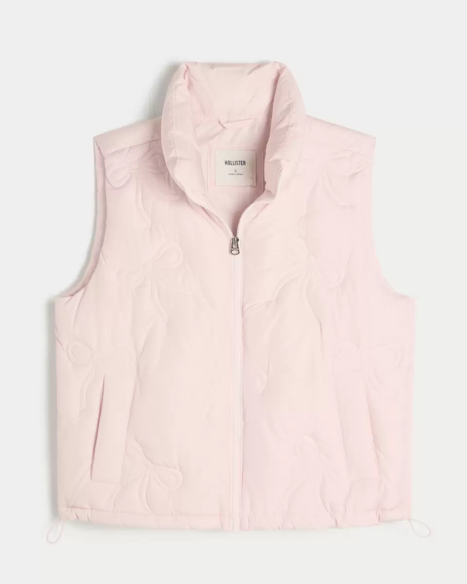Denna mysiga pufferväst har ett överallt sytt rosettmönster och stängning med dragkedja. Dragsko i fåll, mock-neck krage, fickor. Importerad.