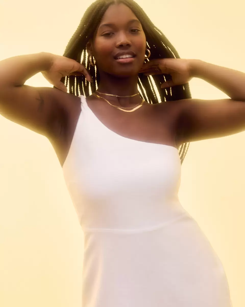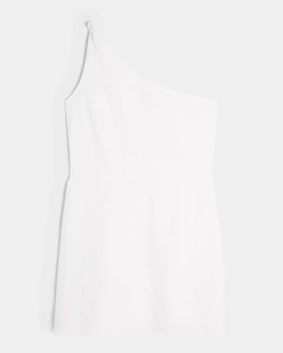 En snygg miniklänning i en mjuk linneblandning, med asymmetrisk halsringning med en vriddetalj vid axelremmen.