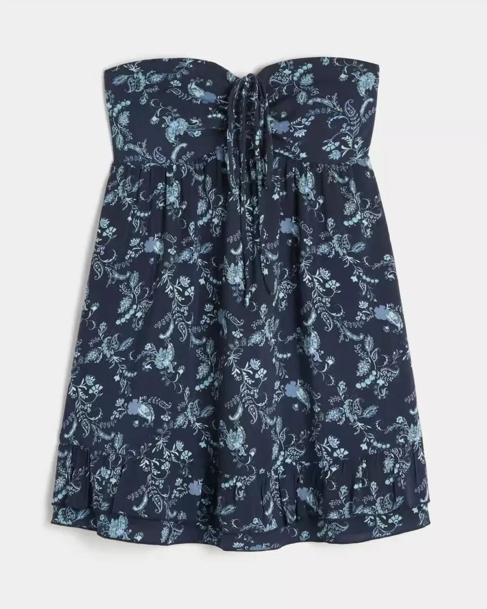 En flytande och supermjuk miniklänning med volang i lagerfåll. Axelbandslös, knäppt med knytband i mitten vid bysten. Importerad.
