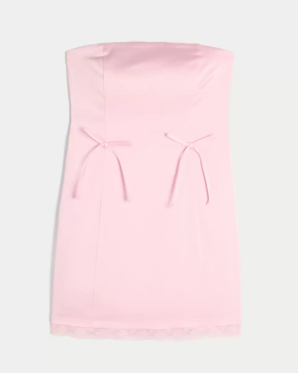Den här supersnygga klänningen är gjord av mjukt satintyg och har rosettdetaljer. Axelbandslös, vacker spetskant vid fållen, bodycon-siluett. Importerad.