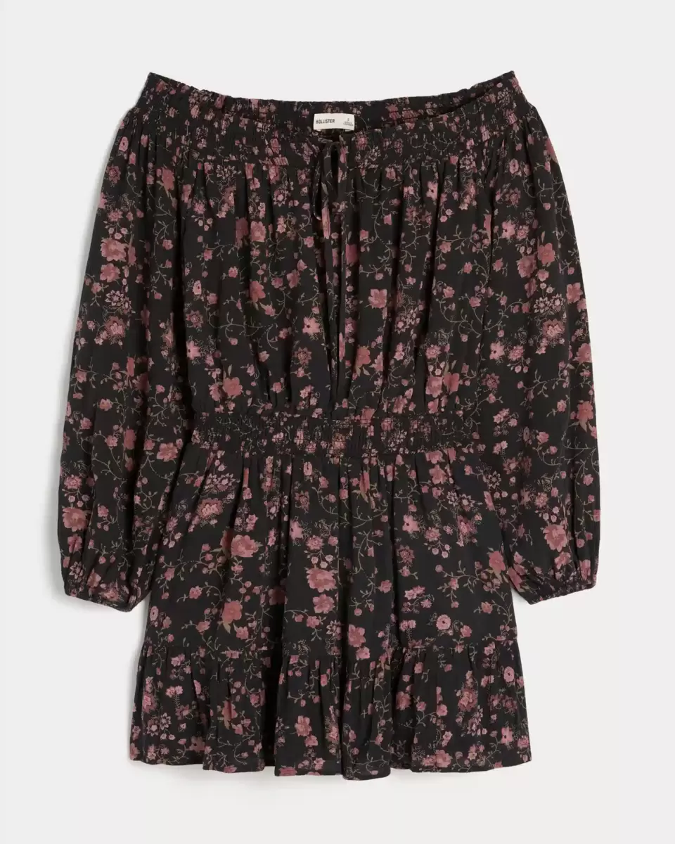 En flytande och supermjuk klänning med en avslappnad halsringning som kan bäras på eller av axeln. Knytdetalj i mitten vid halsringningen, långa ärmar, genomgående mönster. Importerad.