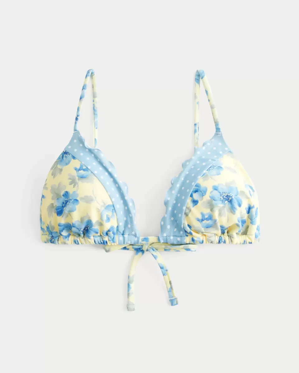 Denna vackra bikinitopp är designad med en triangelsiluett, skarvade mönsterdetaljer, söta volangkanter och knytband. Avtagbar stoppning, knytband. Importerad.
