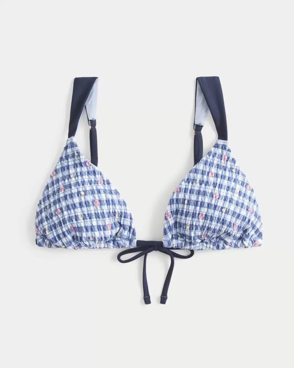 Söt och bekväm, den här bikiniöverdelen är gjord av ett mjukt badtyg med smock. Knytstängning, band över axeln, avtagbar stoppning, triangelsiluett. Importerad.