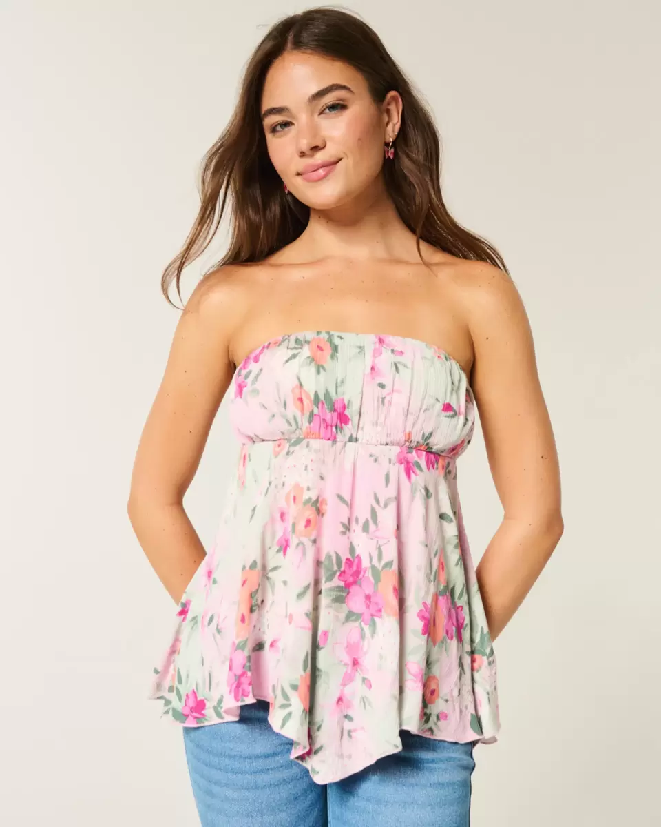 Flytig och supermjuk, den här toppen är gjord av skrynkligt tyg och har en vacker näsduksfåll. Avtagbara axelband, rynkade detaljer genom bysten. Importerad.