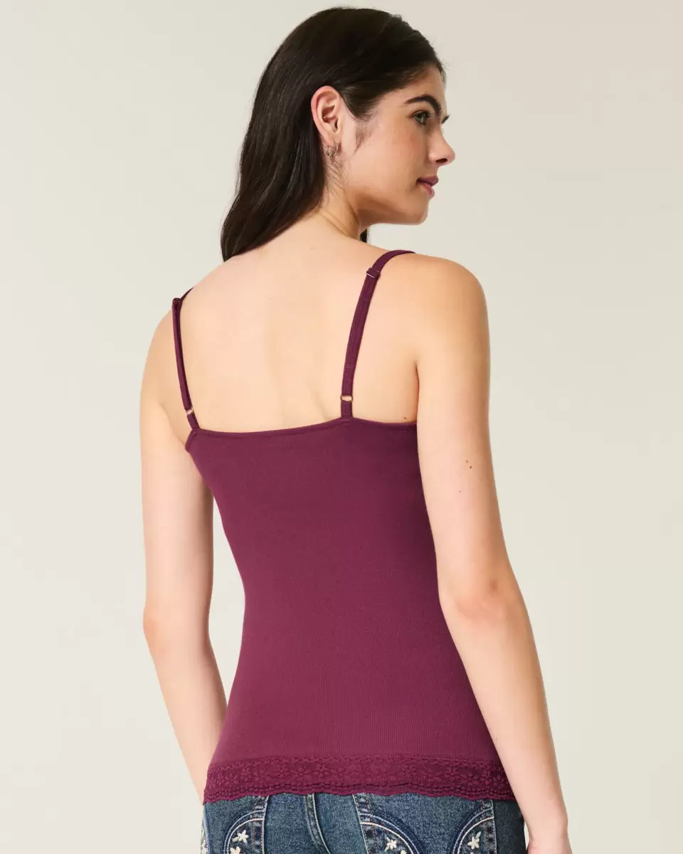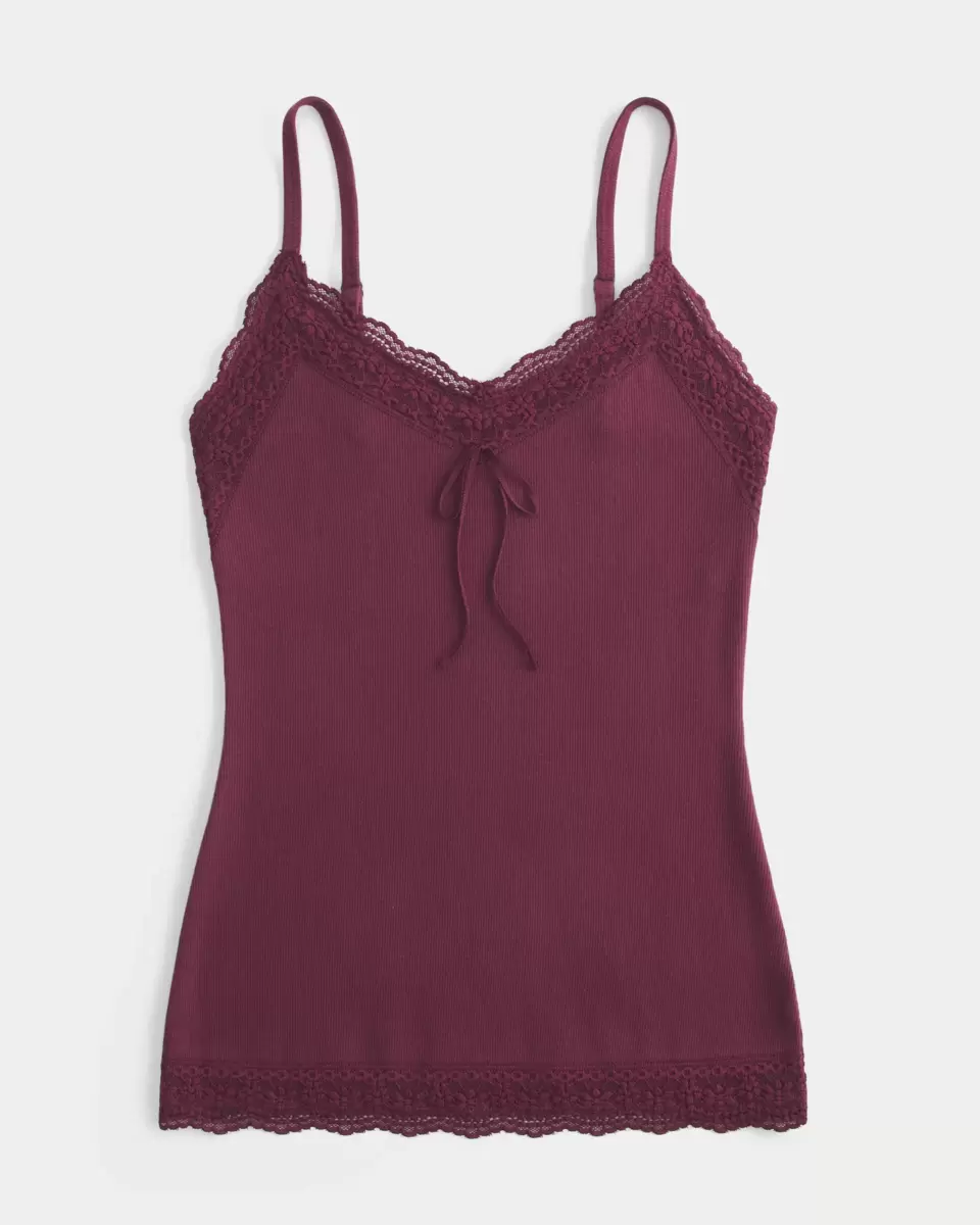 Vacker och supermjuk, denna Y2K-inspirerade cami har spetskanter vid halsen och fållen, plus en rosettdetalj i mitten av halsen. Justerbara remmar. Slim Fit. Importerad.