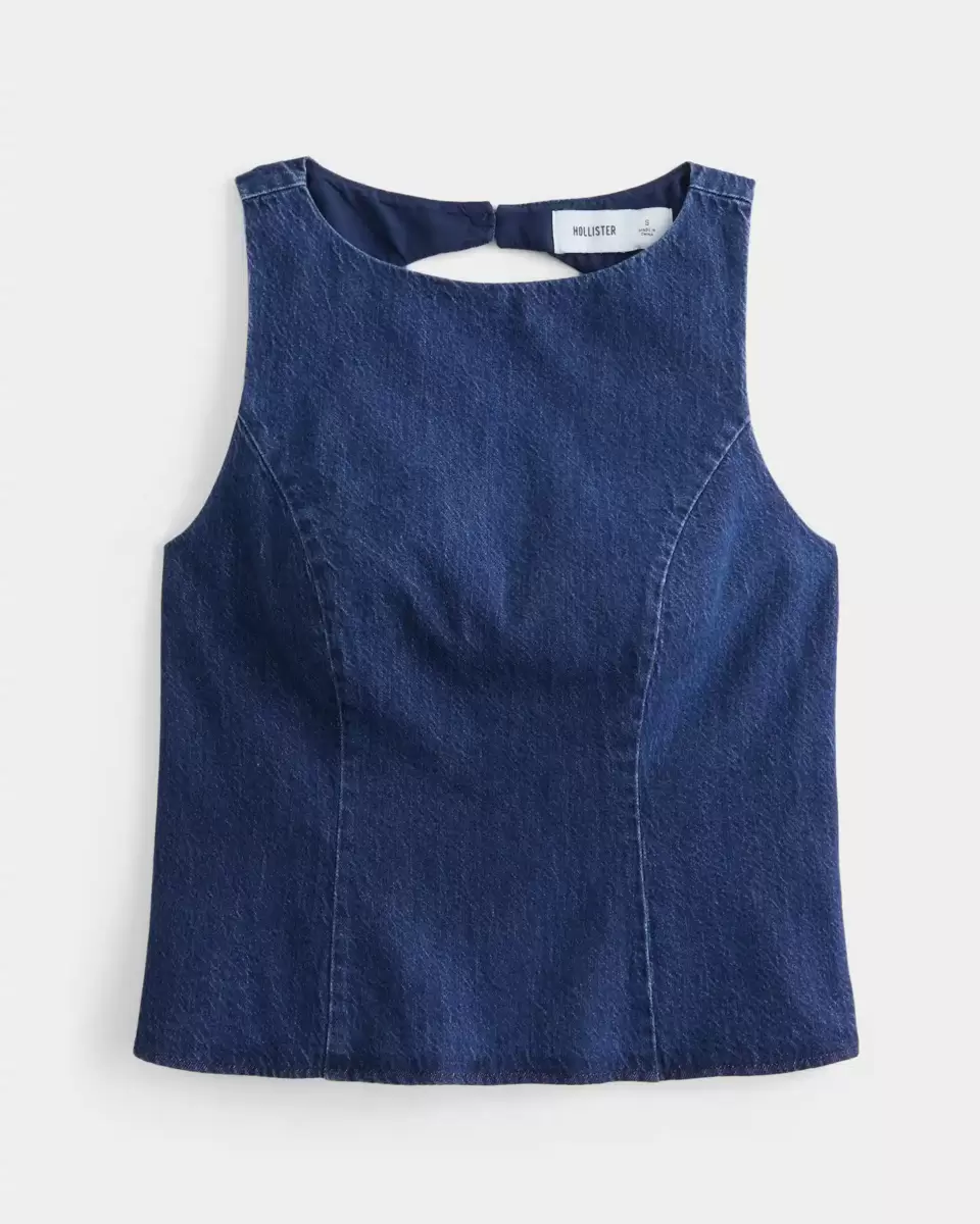 Denna söta jeansblus har en öppen rygg och knytbågedetalj. Hög halsringning, avtagbara kuddar. Slim Fit.